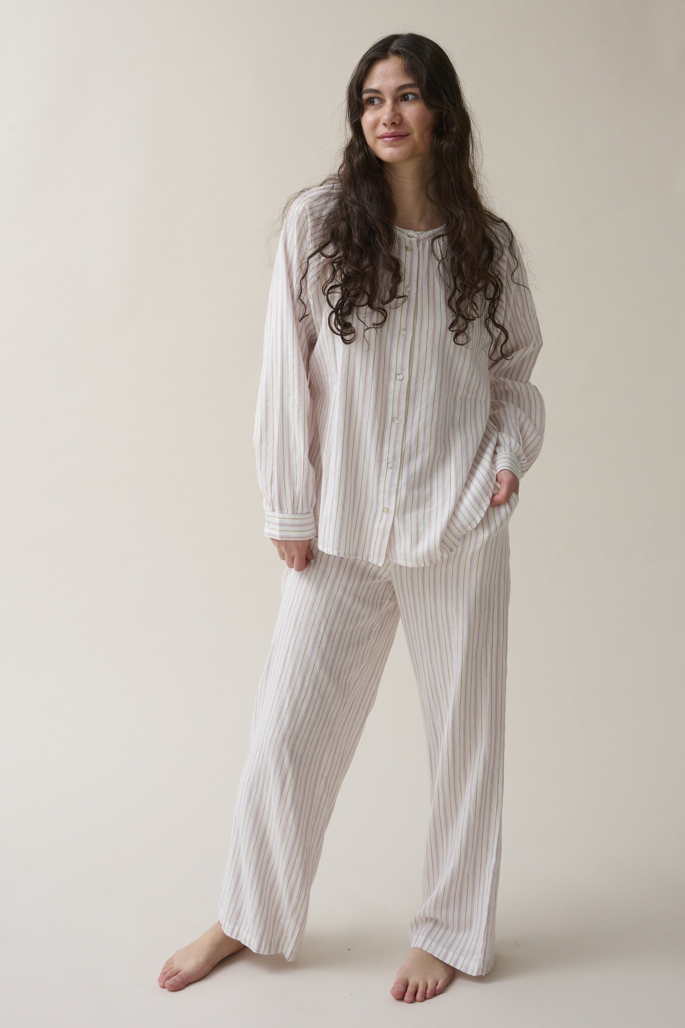 This pyjama set is made from lightweight breathable cotton flannel - the perfect choice for comfy evenings and nights. The top with buttons has a fine finish.
