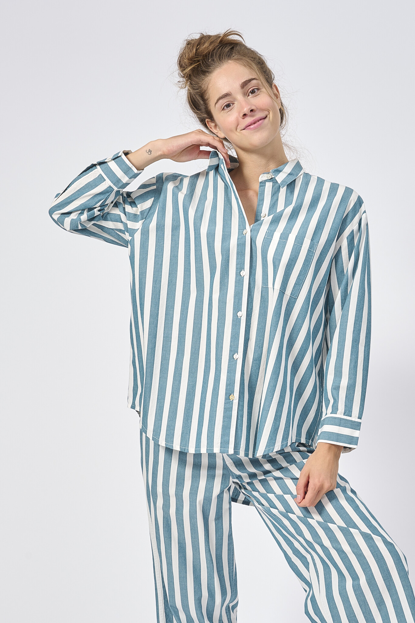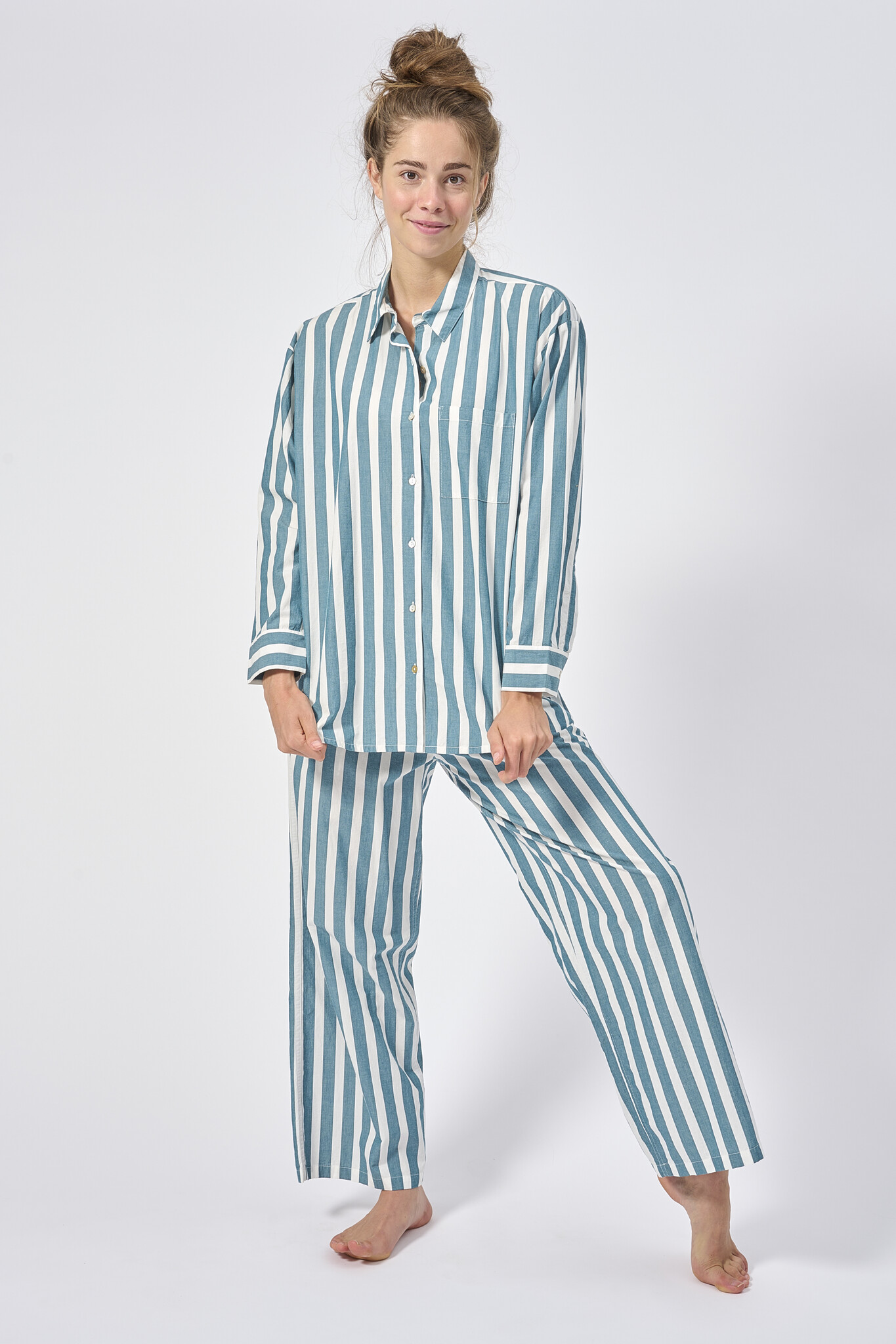 Stylish and oh so comfortable. DorŽlit's pyjama set is everything you need for a relaxing evening in. The long-sleeve ovesized shirt fastens with mother-of-pearl buttons, while the pants are fitted with a drawstring waistband.