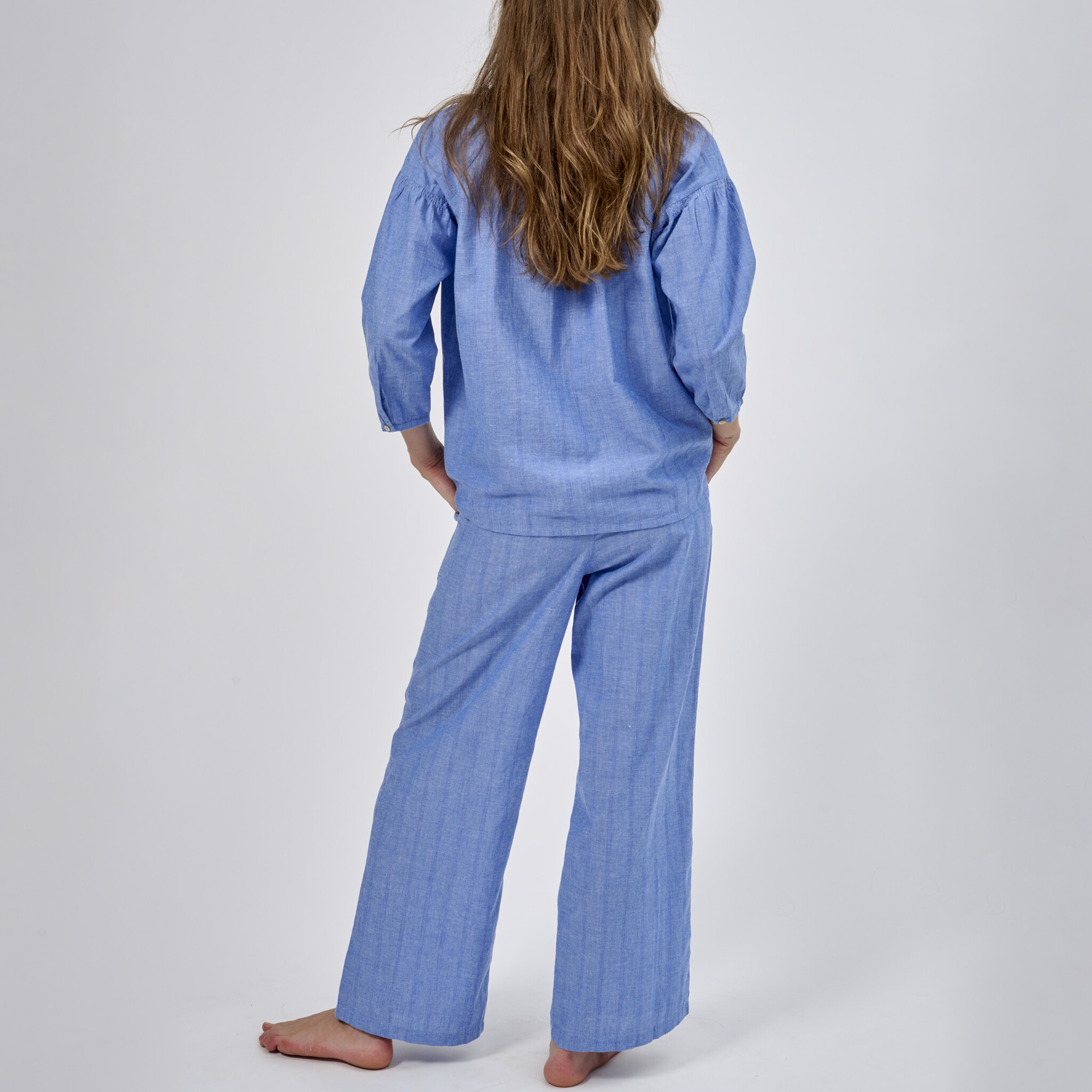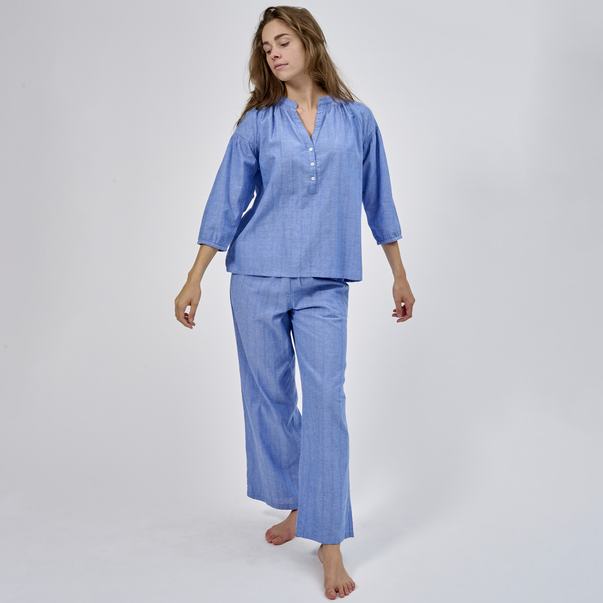 Dorélit's pyjama set is made from soft light weight cotton, you can wear them year-round. Decorated with a half buttoned placket, the shirt has 3/4 sleeves. The long pants have a flexible elasticated waistband.