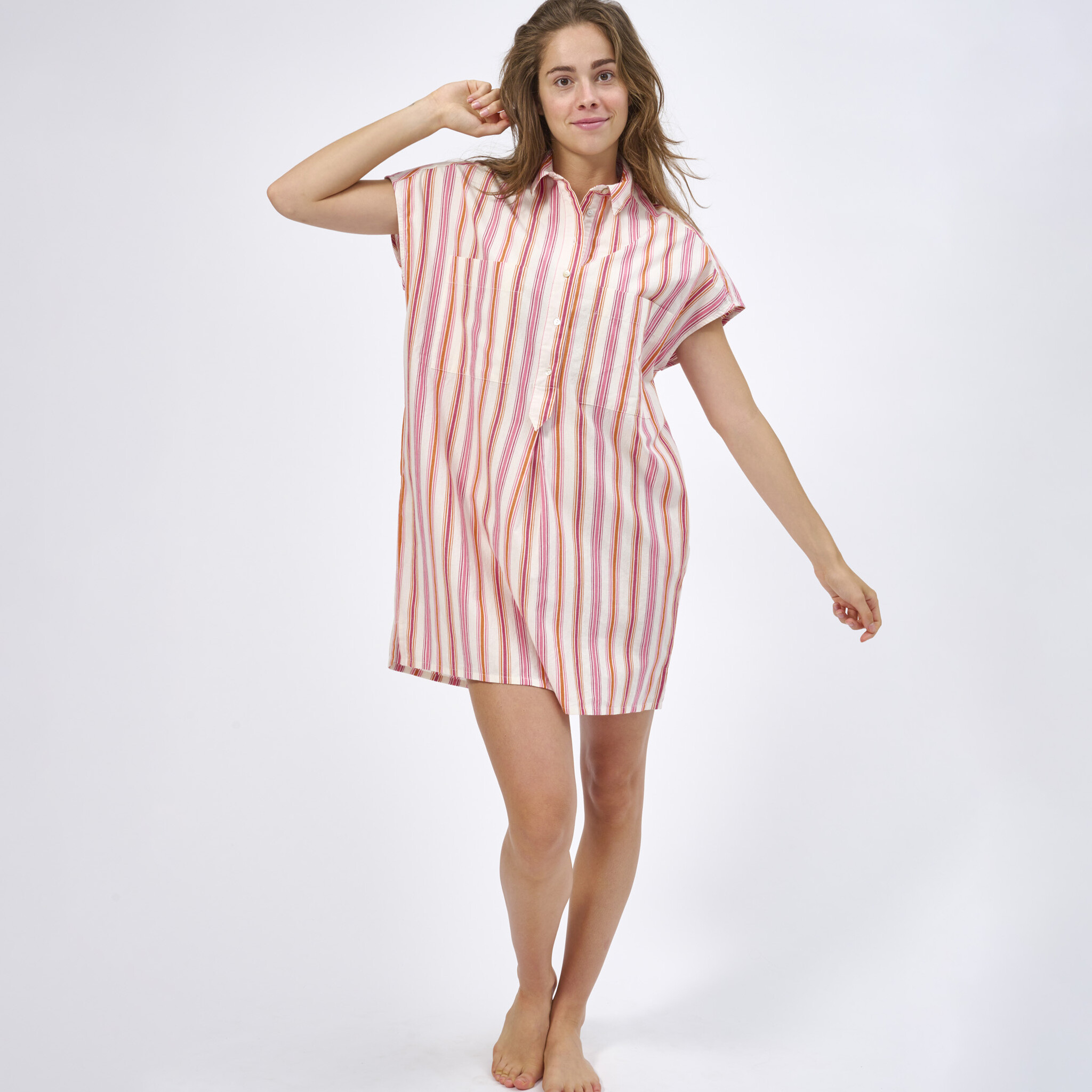The stylish and versatile nightdress, is cut from soft breathable light weight cotton, it has a relaxed fit and short dropshoulder sleeves. Wear yours while lounging at home or with sandals to brunch on vacation.