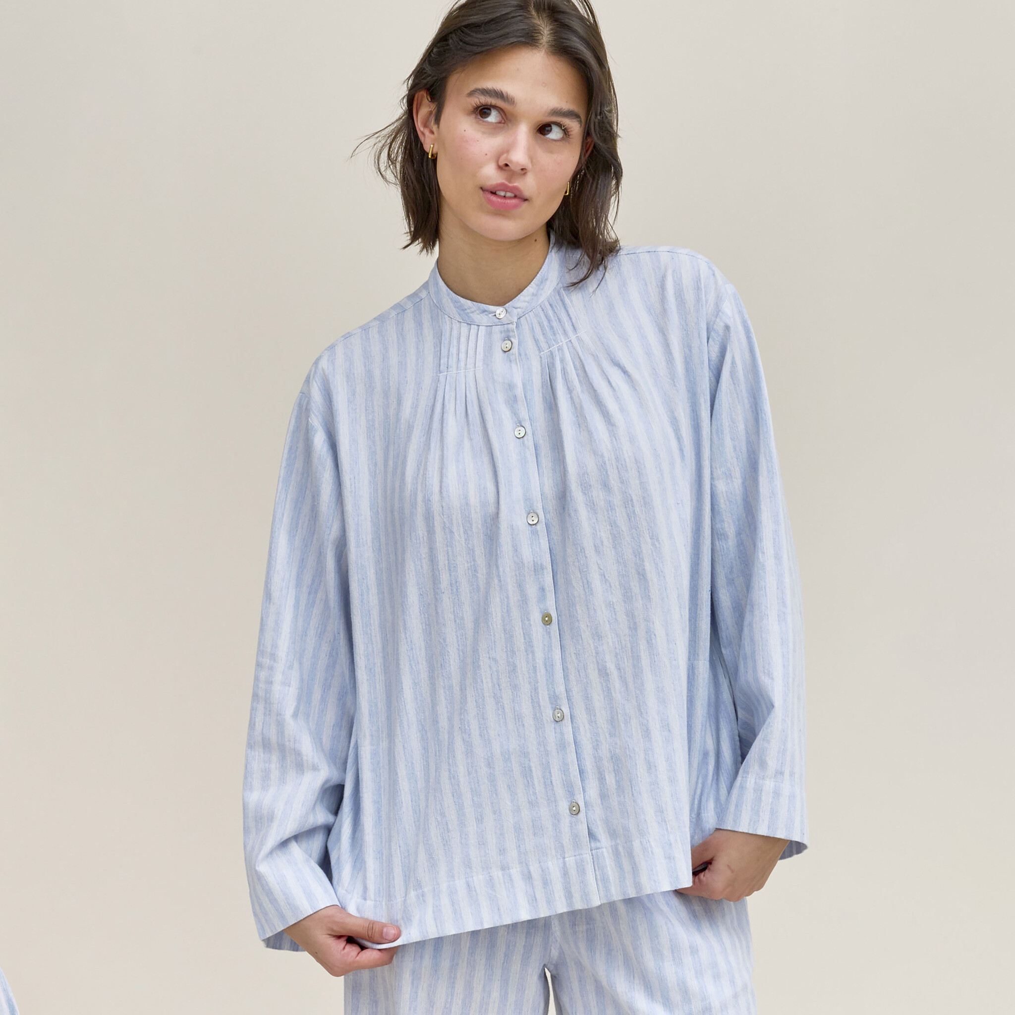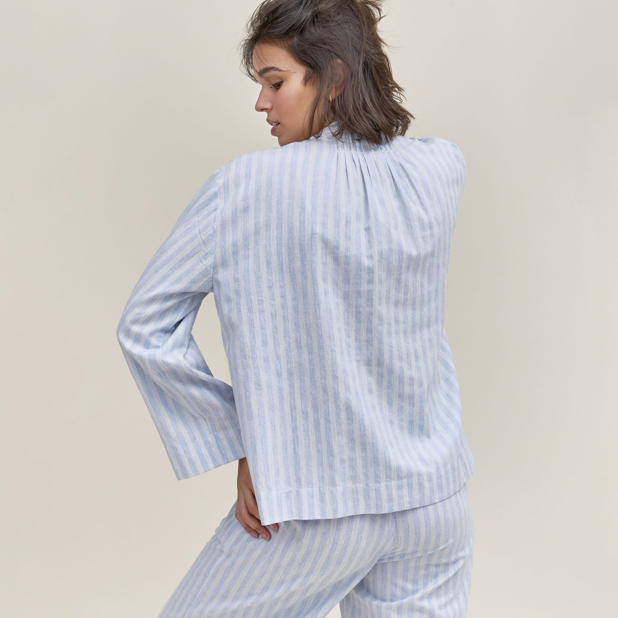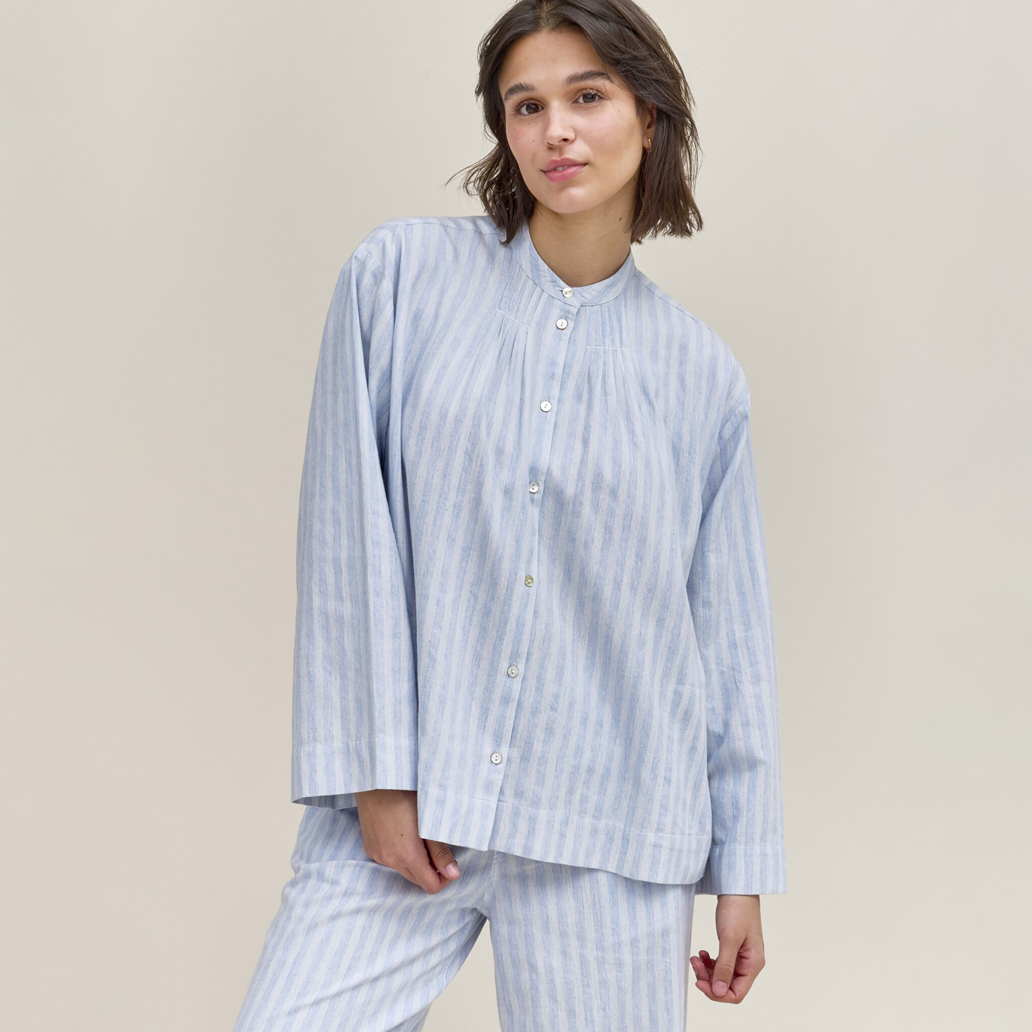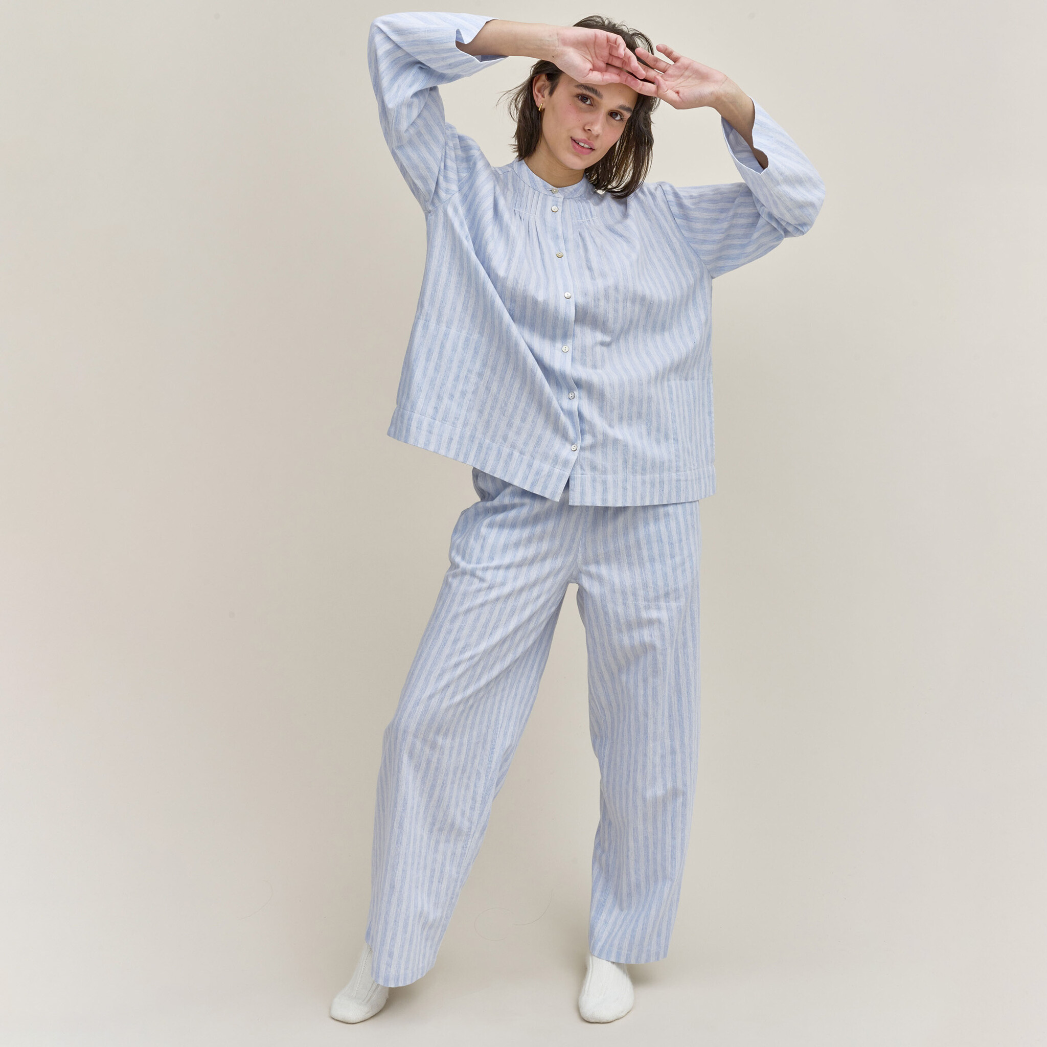 De pyjama van Dorélit is gemaakt van zacht flanellen katoen versierd met fijne strepen. Dit ontwerp heeft een relaxed silhouet, het doorknoophemd is afgewerkt met fijne plooitjes aan de kraag en in de zijkanten zijn zakken verwerkt. De lange broek is voorzien van een elastische tailleband voor uw comfort.