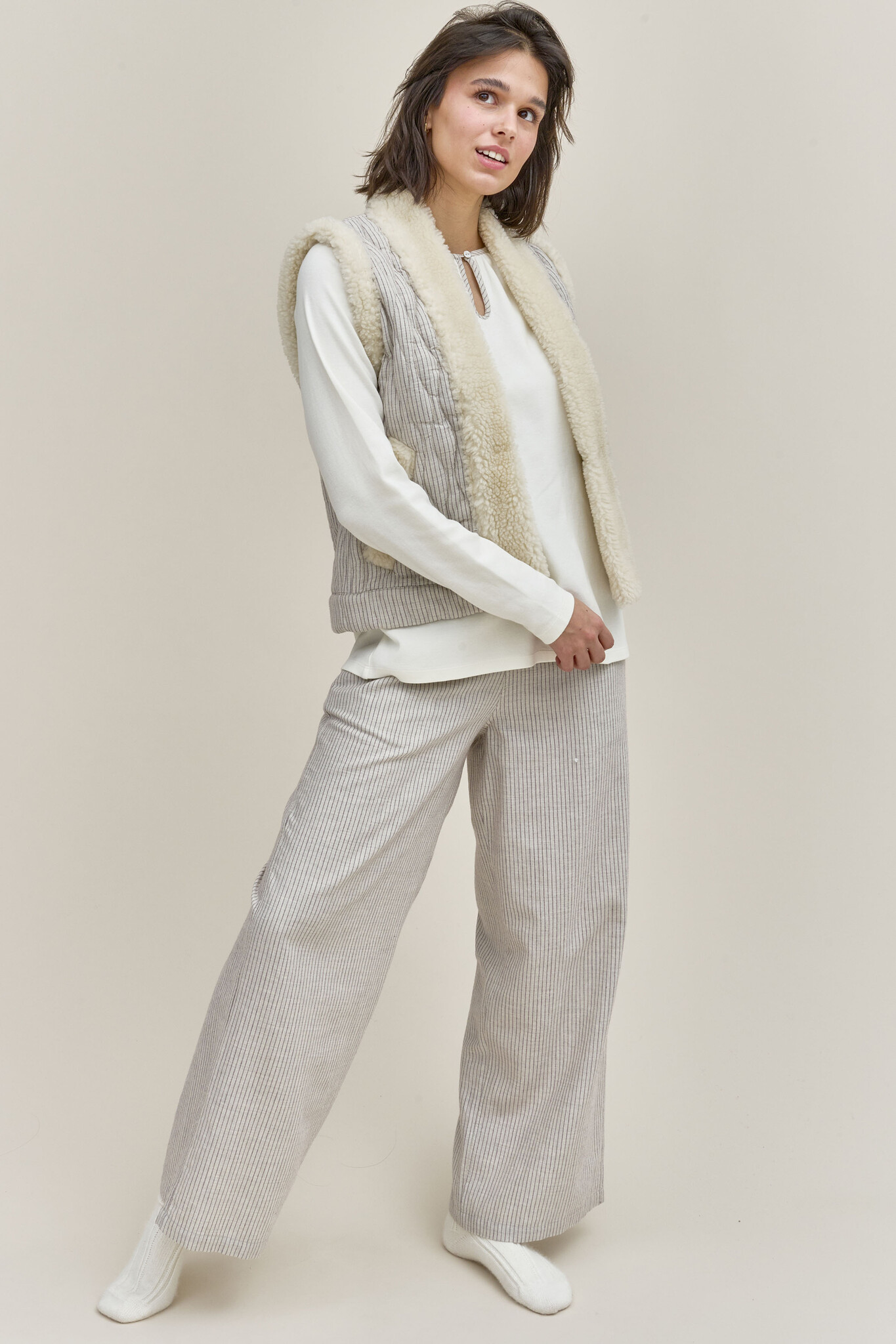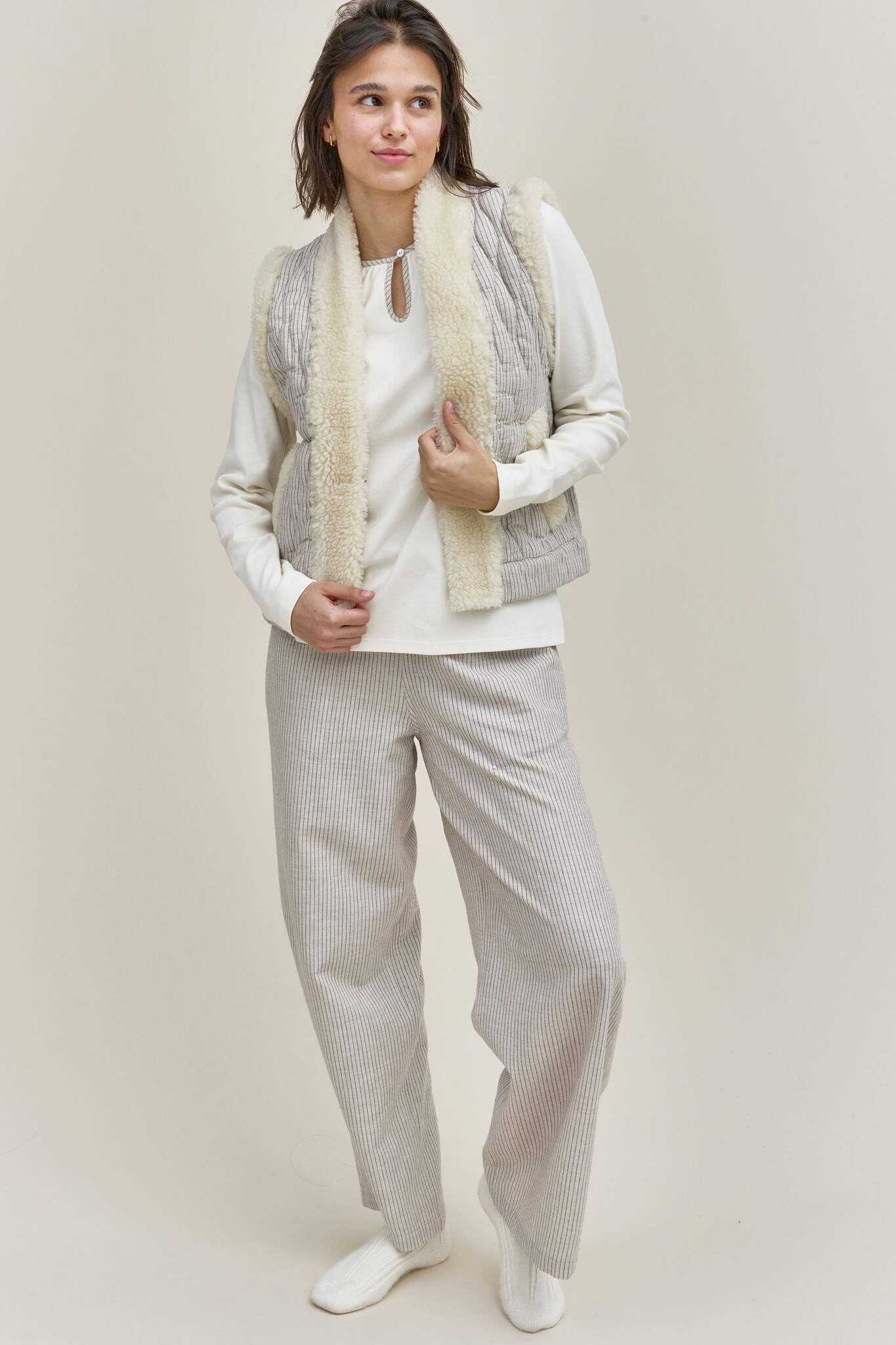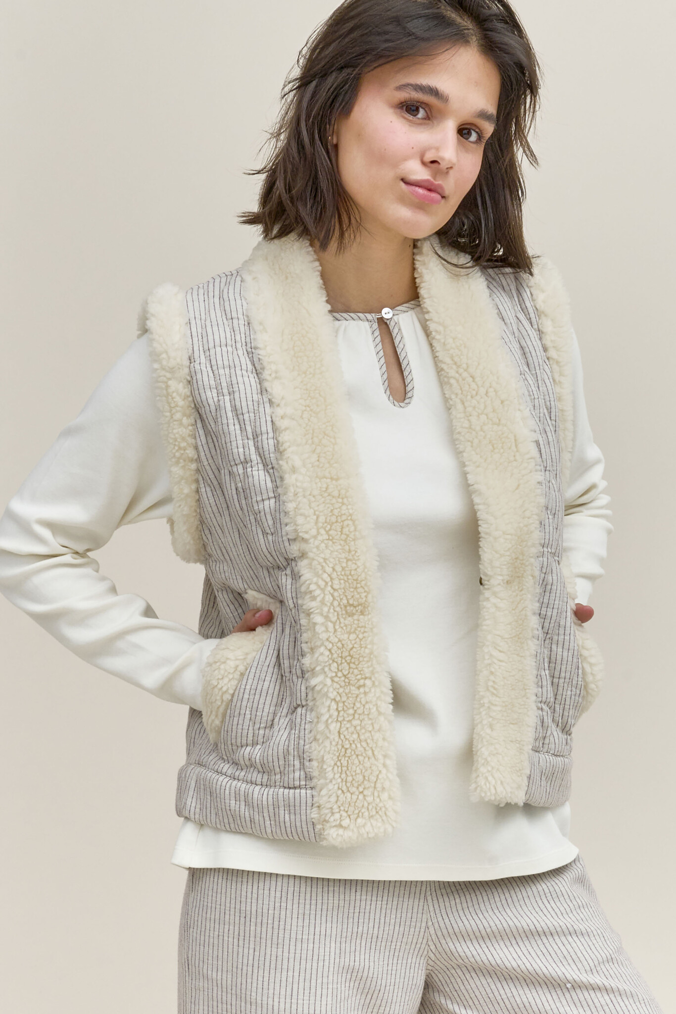 Dit korte en mouwloos jasje van Dorélit is zo veelzijdig. Het is gemaakt van zeer zacht gewatteerde flanelkatoen en is gevoerd met teddy.