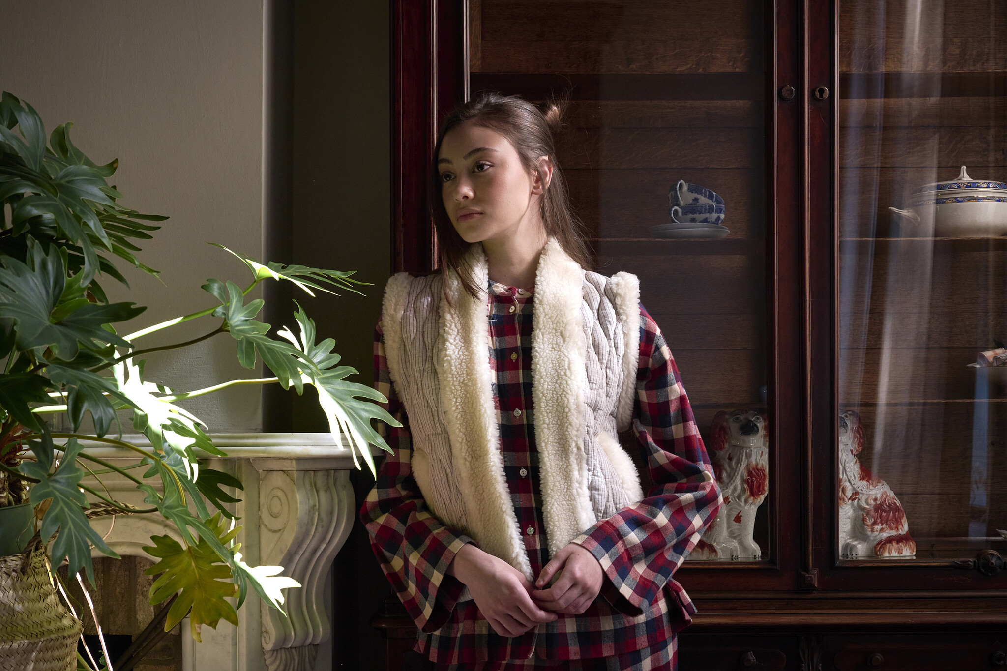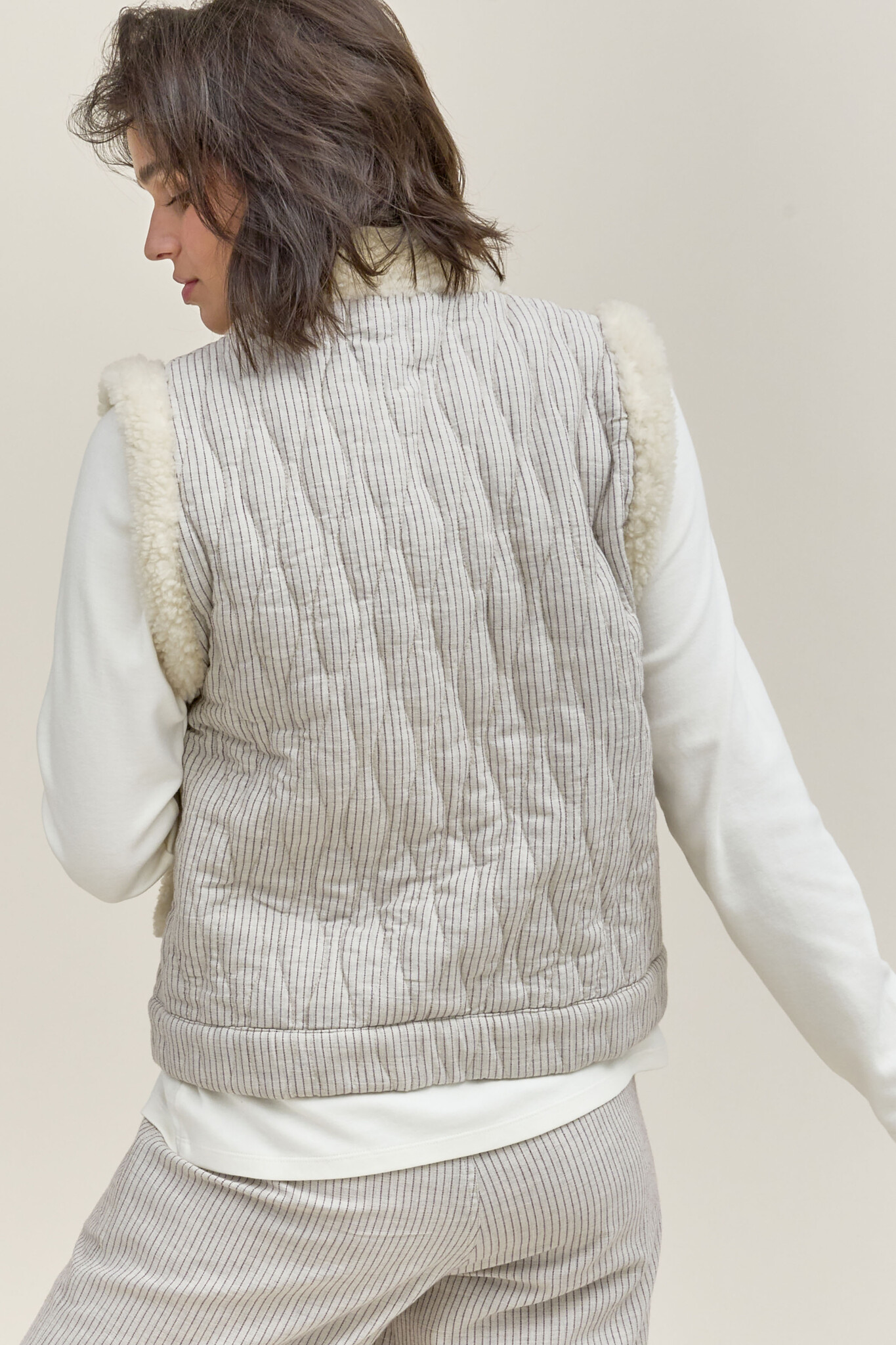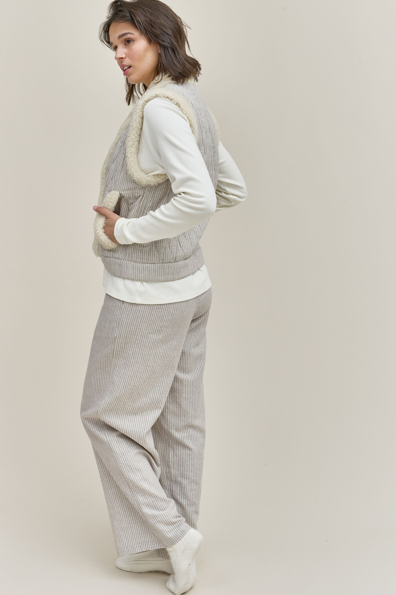Dit korte en mouwloos jasje van Dorélit is zo veelzijdig. Het is gemaakt van zeer zacht gewatteerde flanelkatoen en is gevoerd met teddy.