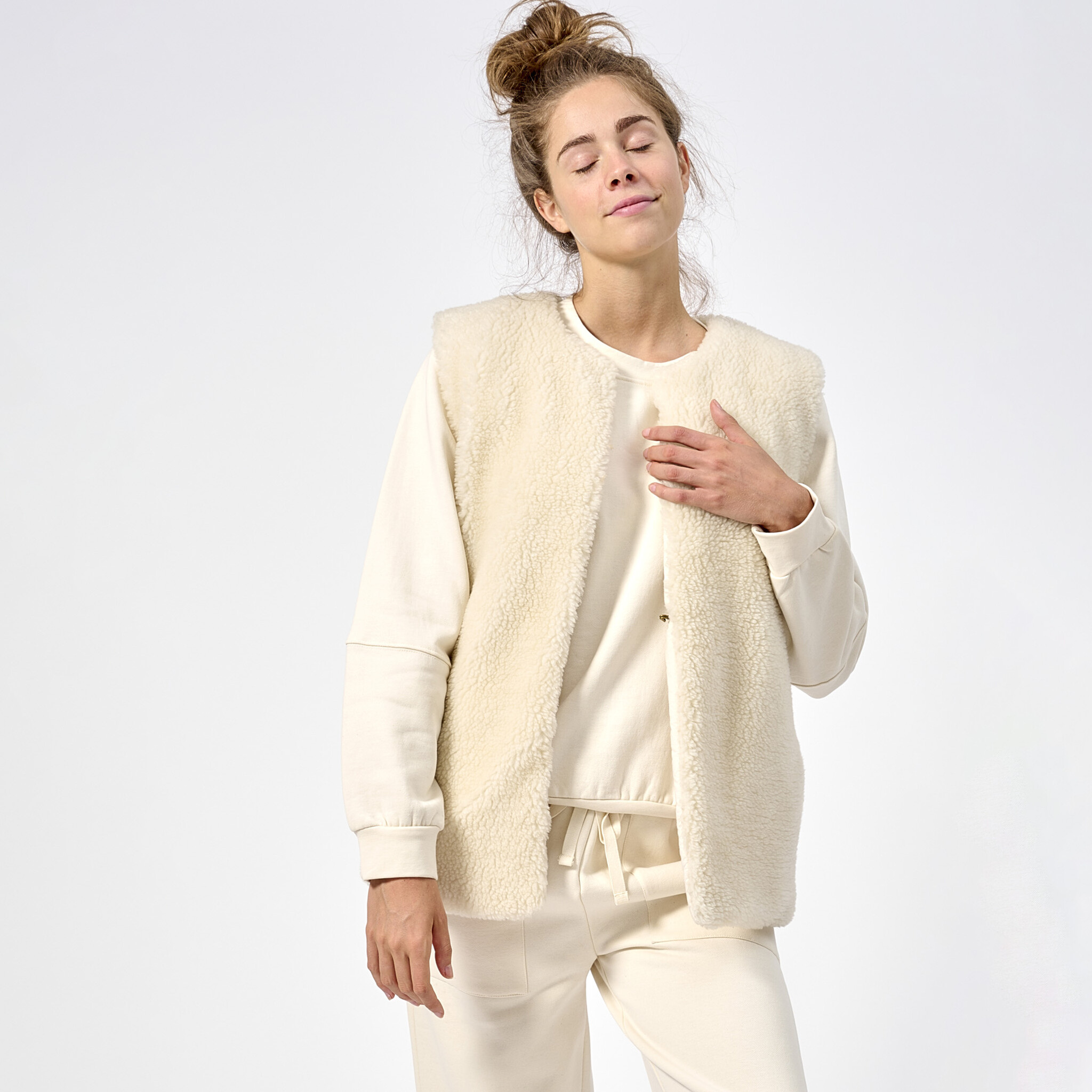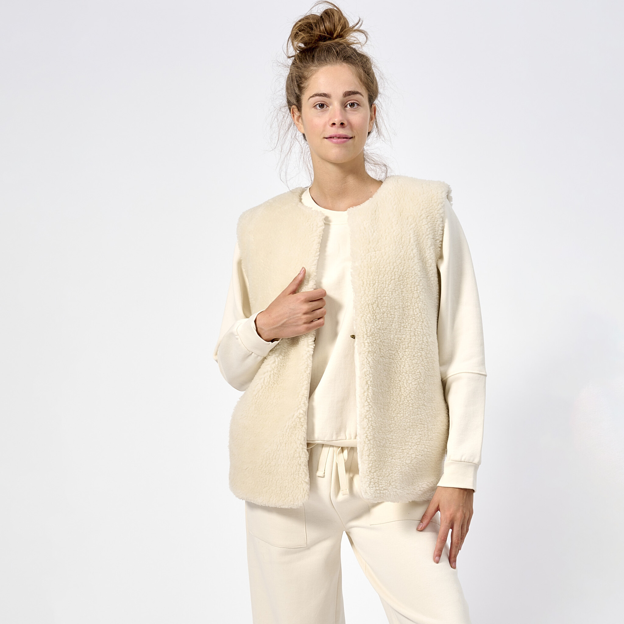 Dit korte en mouwloos jasje van Dorélit is zo veelzijdig. Het is gemaakt van zeer zachte teddy en is gevoerd met zeer dunne wattine.