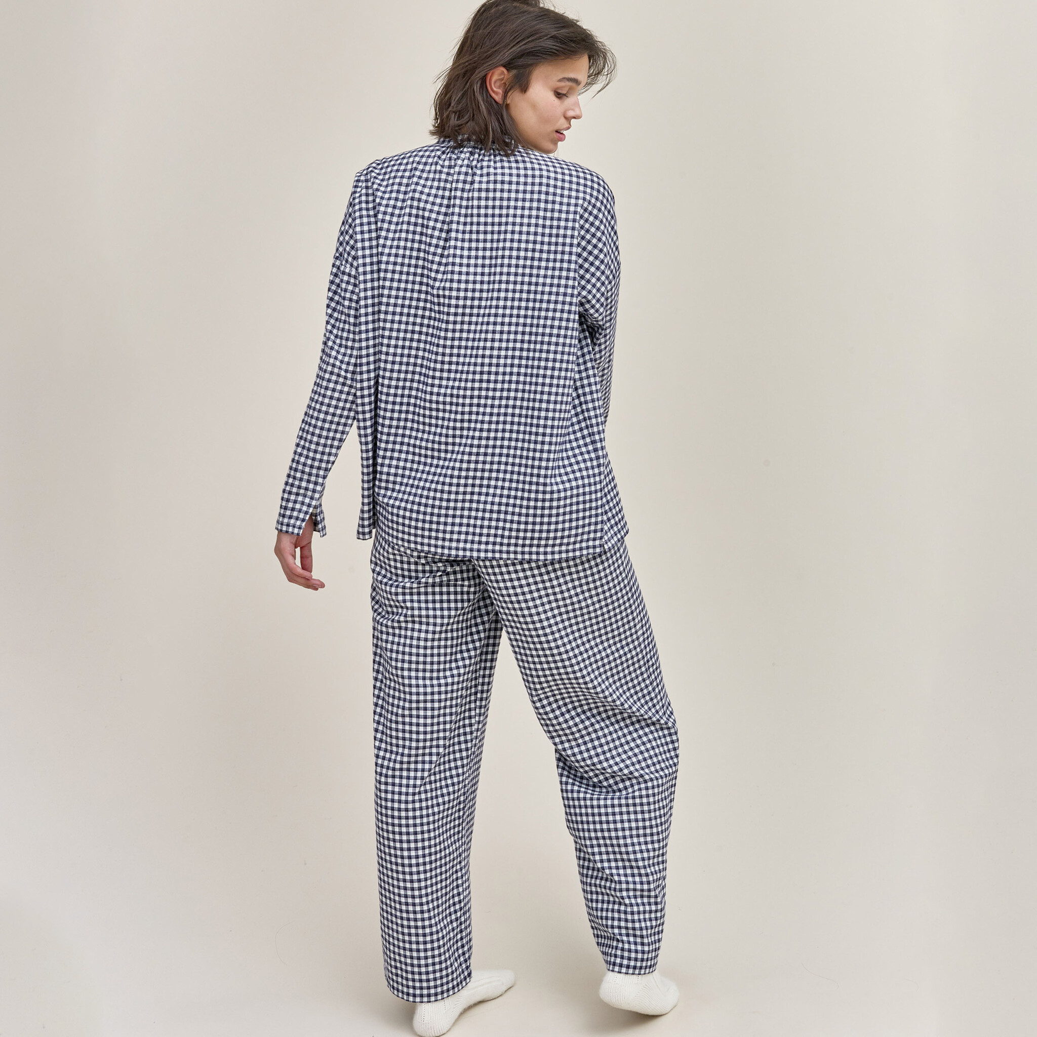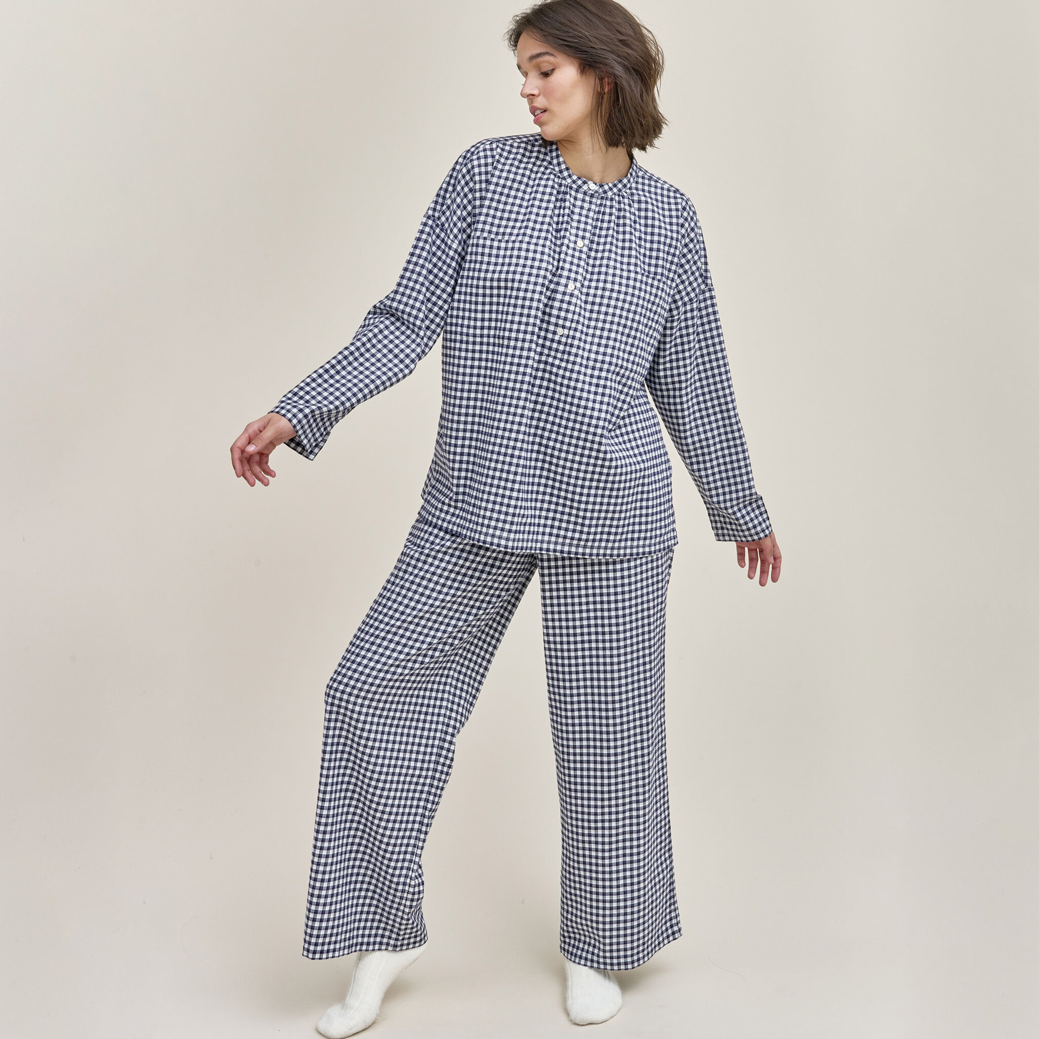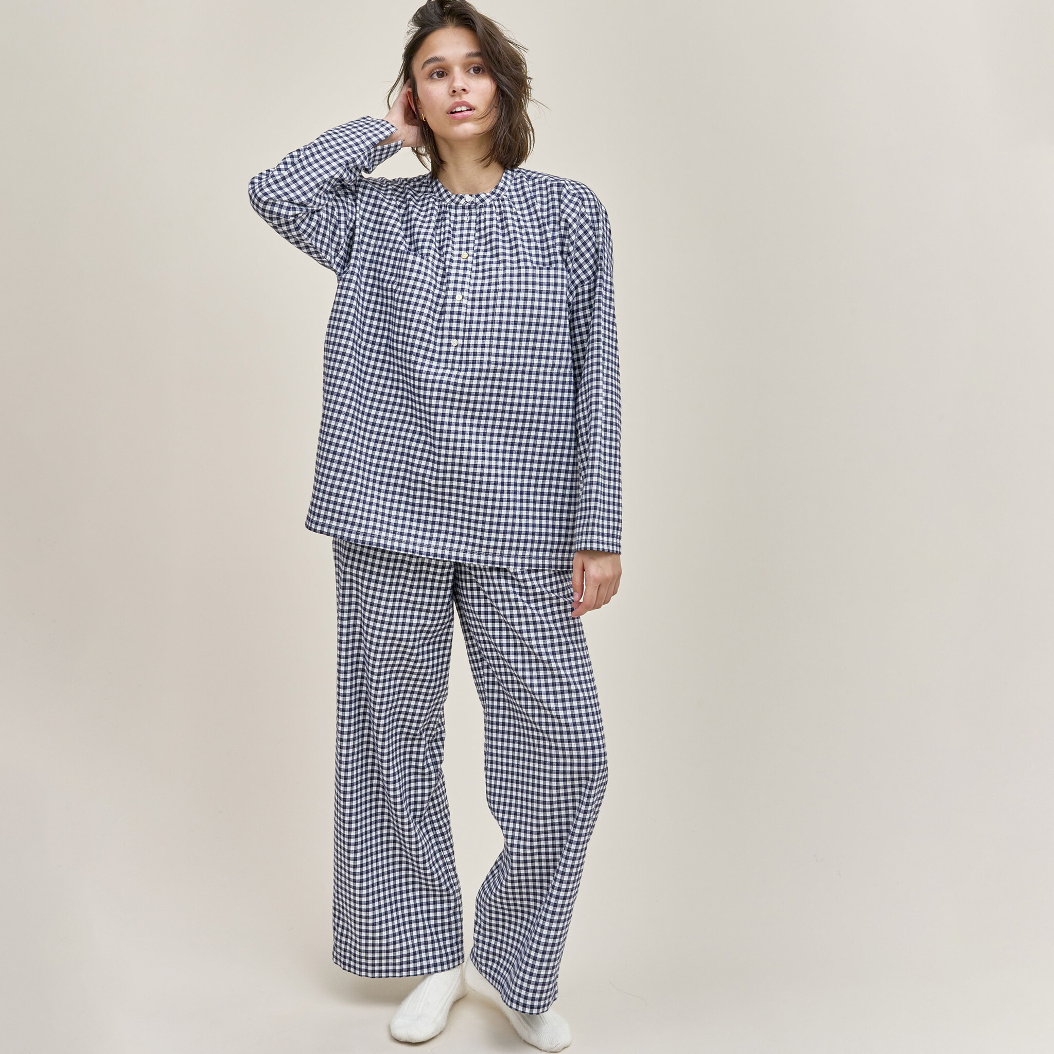De Dorélit pyjama is gemaakt van licht ademend katoenflanel, de perfecte keuze voor comfortabele avonden en nachten. De top met knopen heeft een opstaande kraag en de lange broek is afgewerkt met een elastische tailleband.
