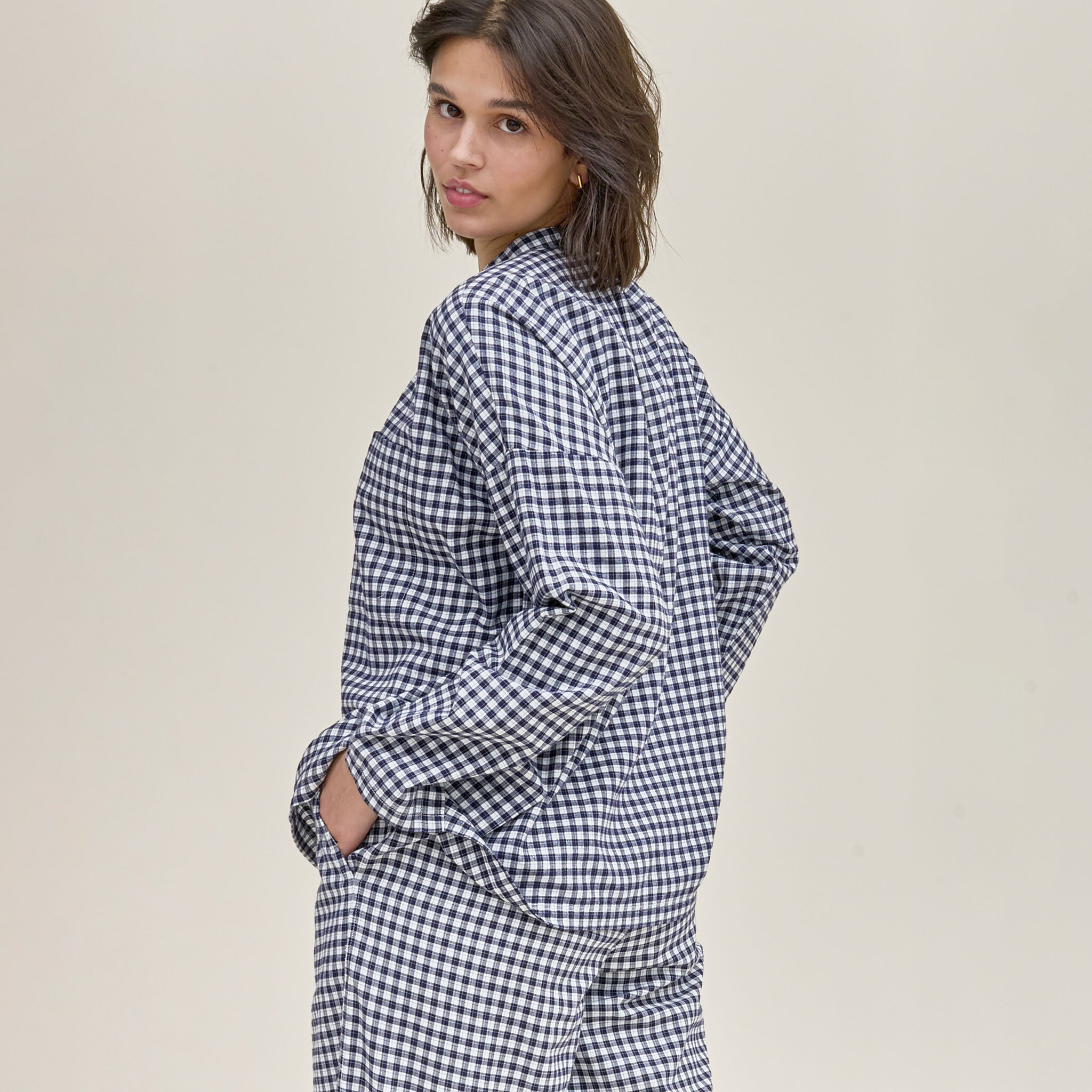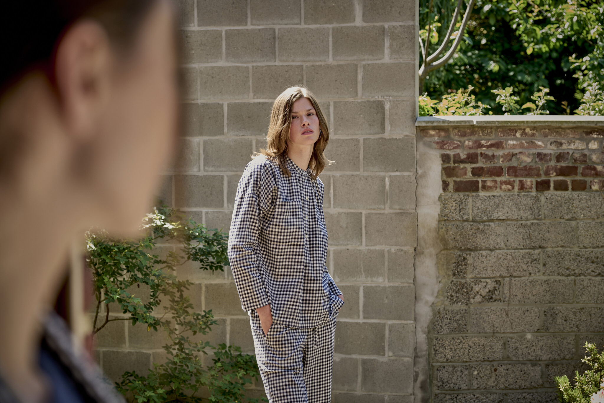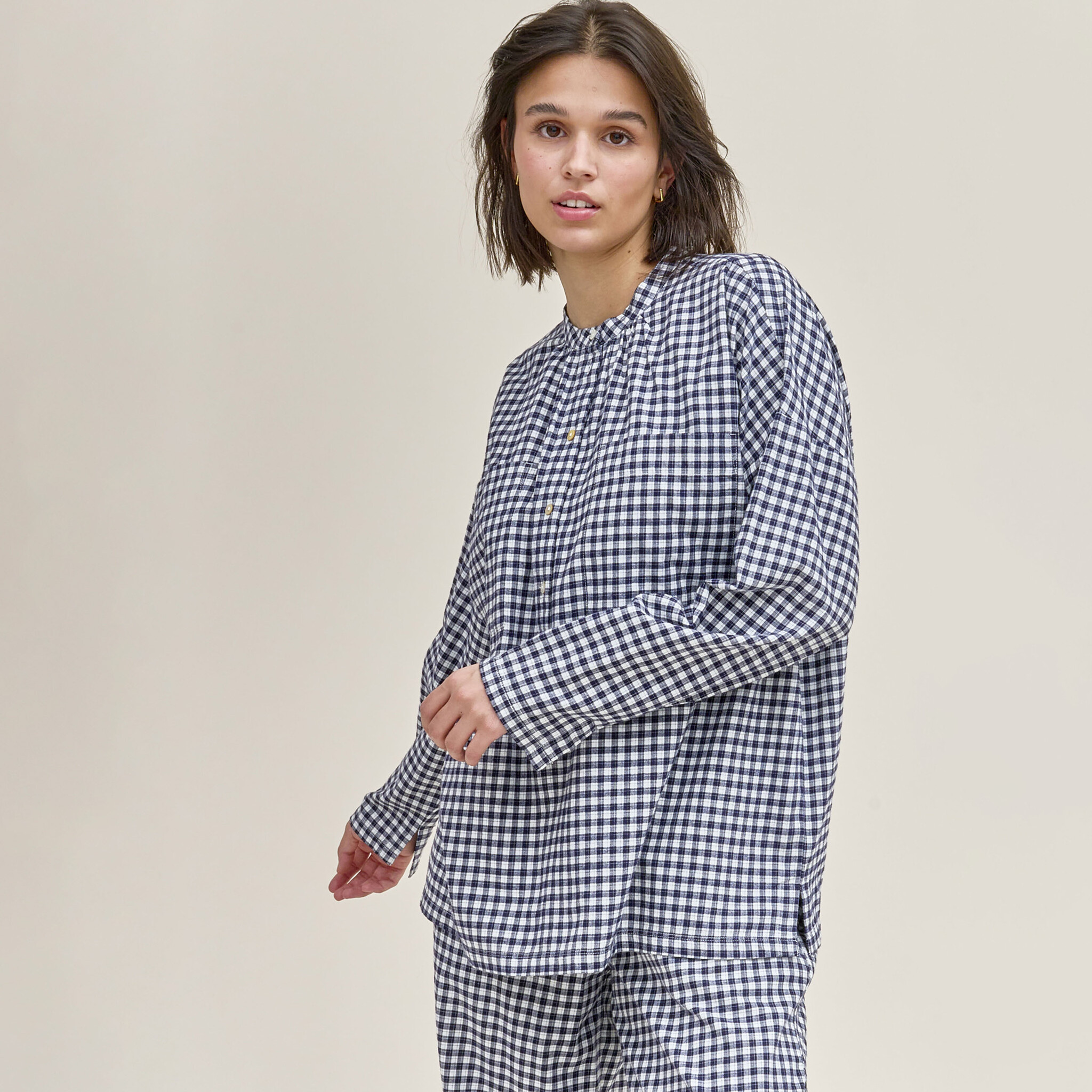 De Dorélit pyjama is gemaakt van licht ademend katoenflanel, de perfecte keuze voor comfortabele avonden en nachten. De top met knopen heeft een opstaande kraag en de lange broek is afgewerkt met een elastische tailleband.