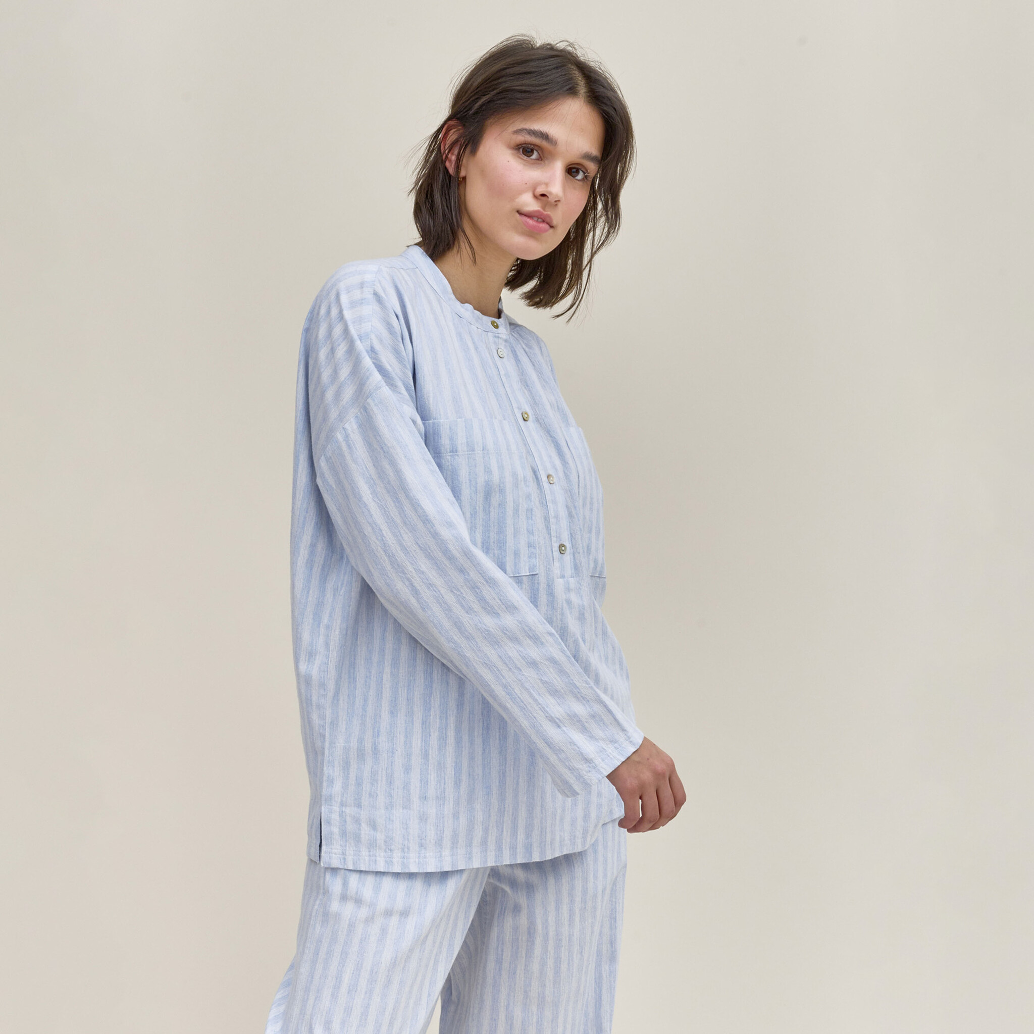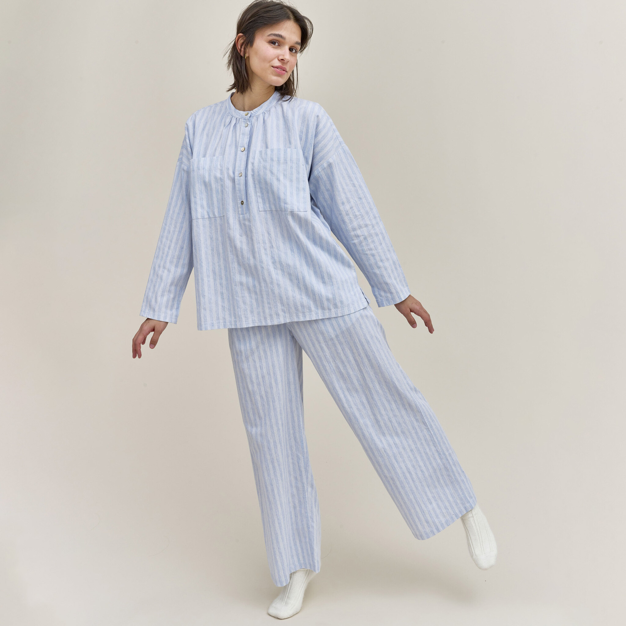De Dorélit pyjama is gemaakt van licht ademend katoenflanel, de perfecte keuze voor comfortabele avonden en nachten. De top met knopen heeft een opstaande kraag en de lange broek is afgewerkt met een elastische tailleband.
