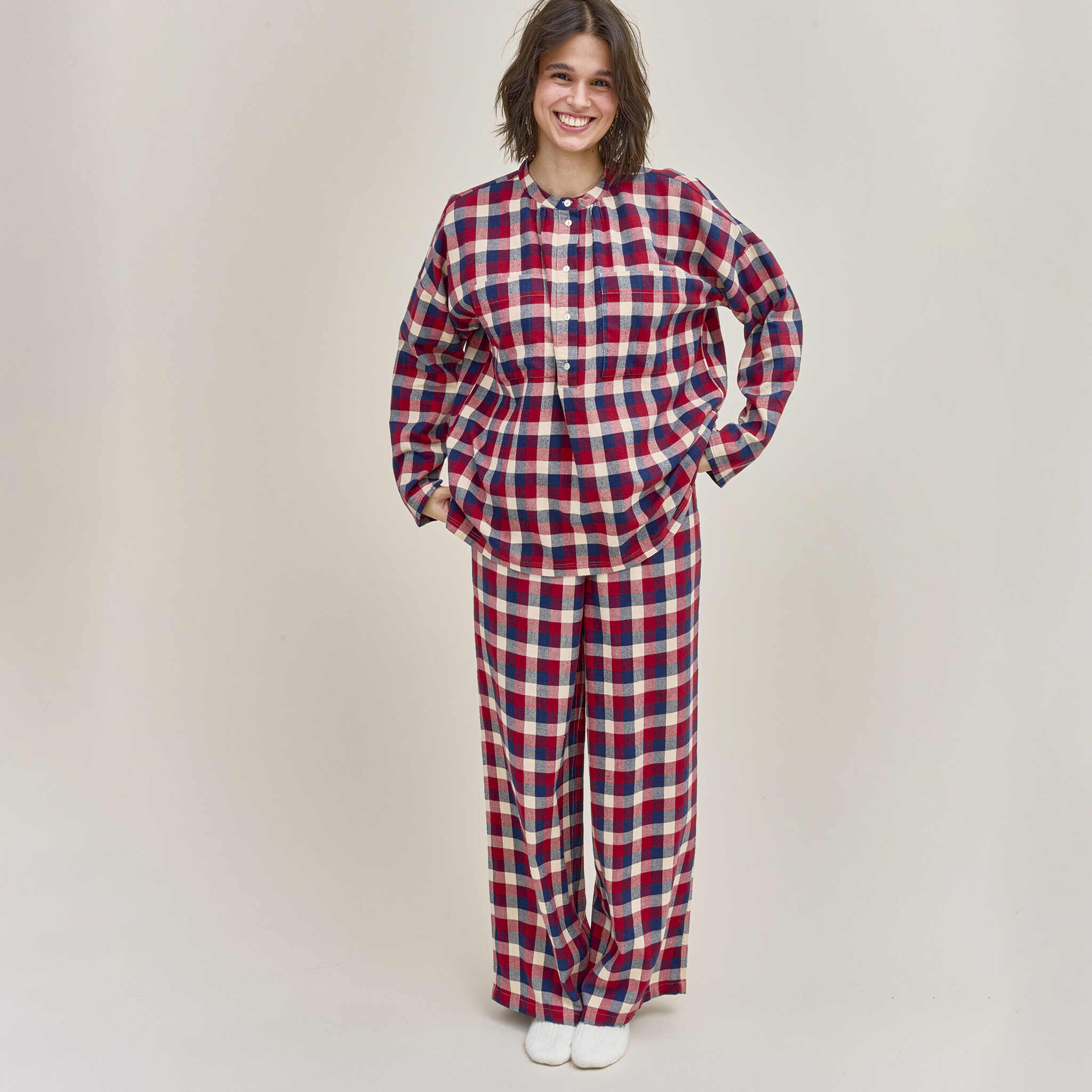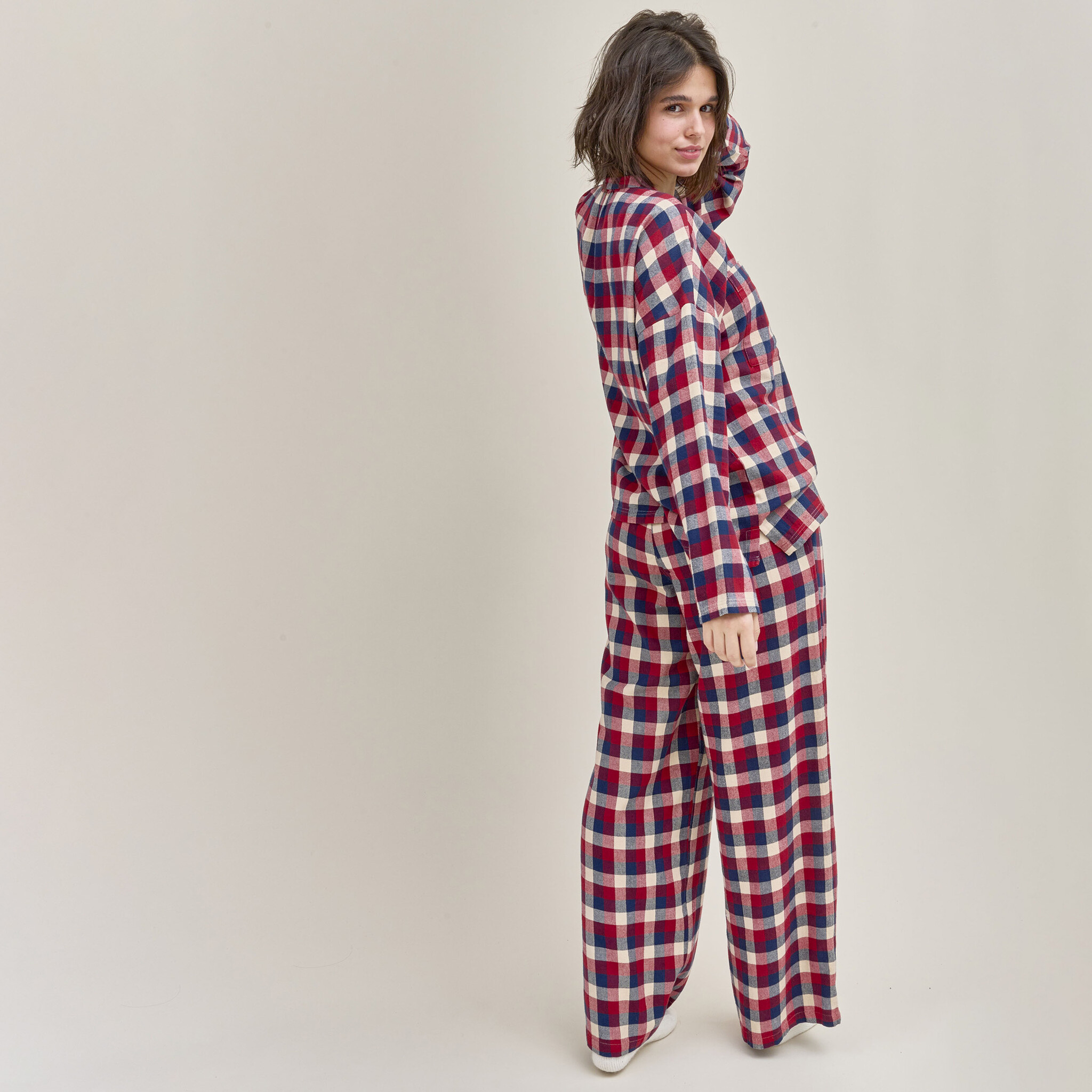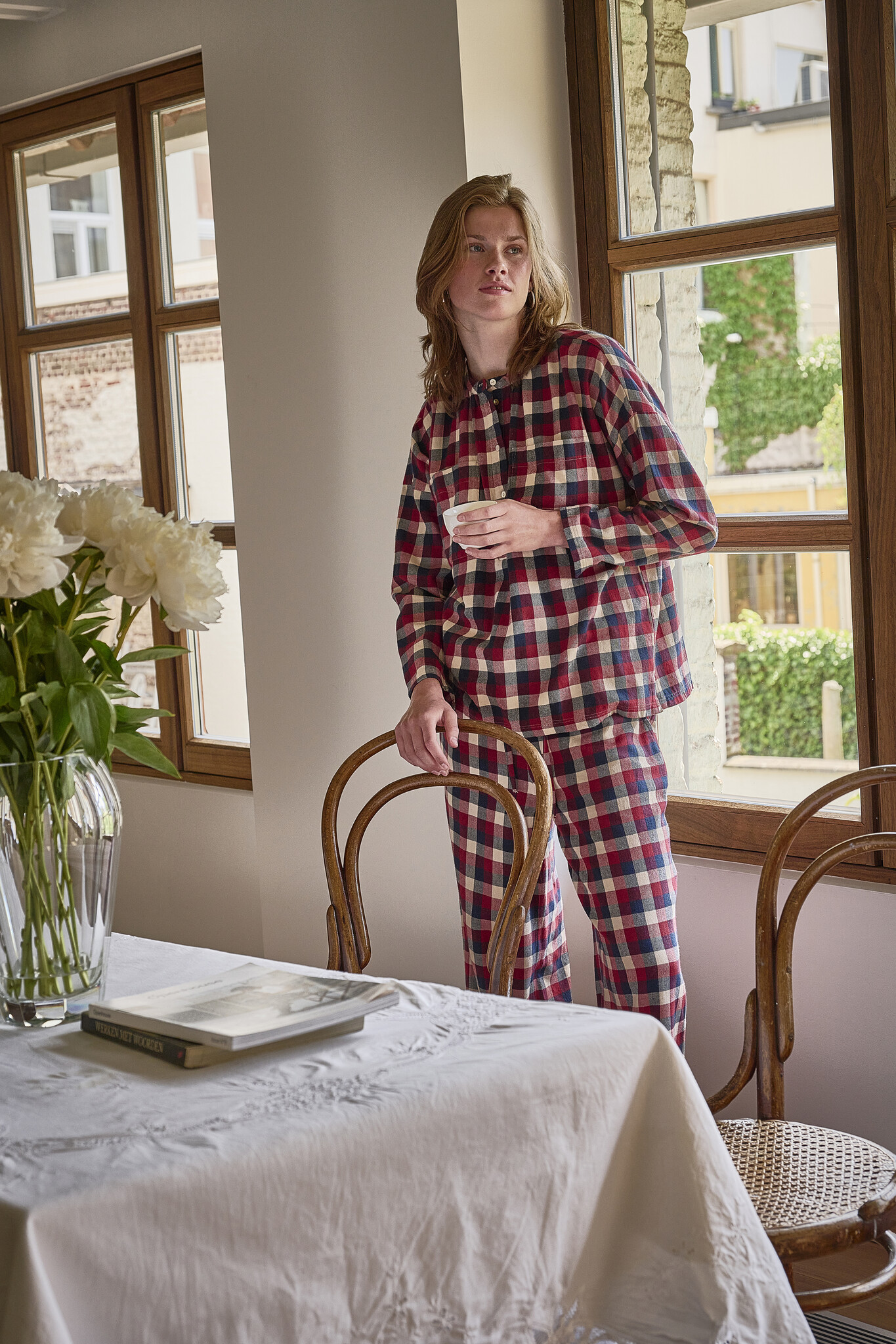 De Dorélit pyjama is gemaakt van licht ademend katoenflanel, de perfecte keuze voor comfortabele avonden en nachten. De top met knopen heeft een opstaande kraag en de lange broek is afgewerkt met een elastische tailleband.