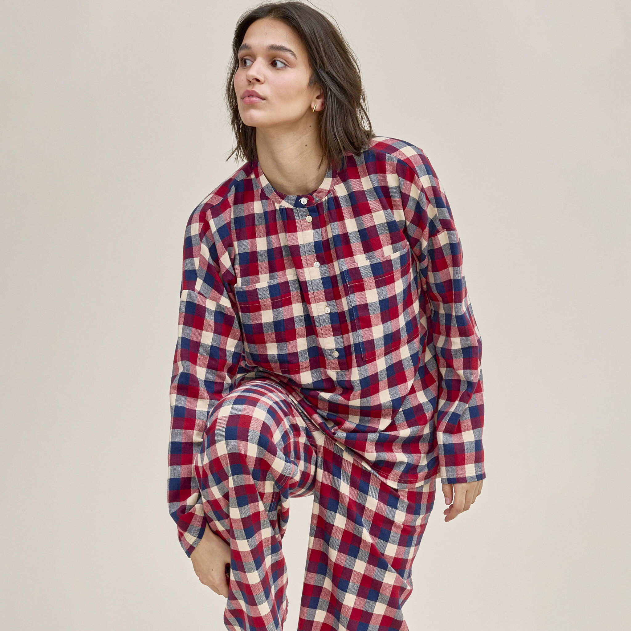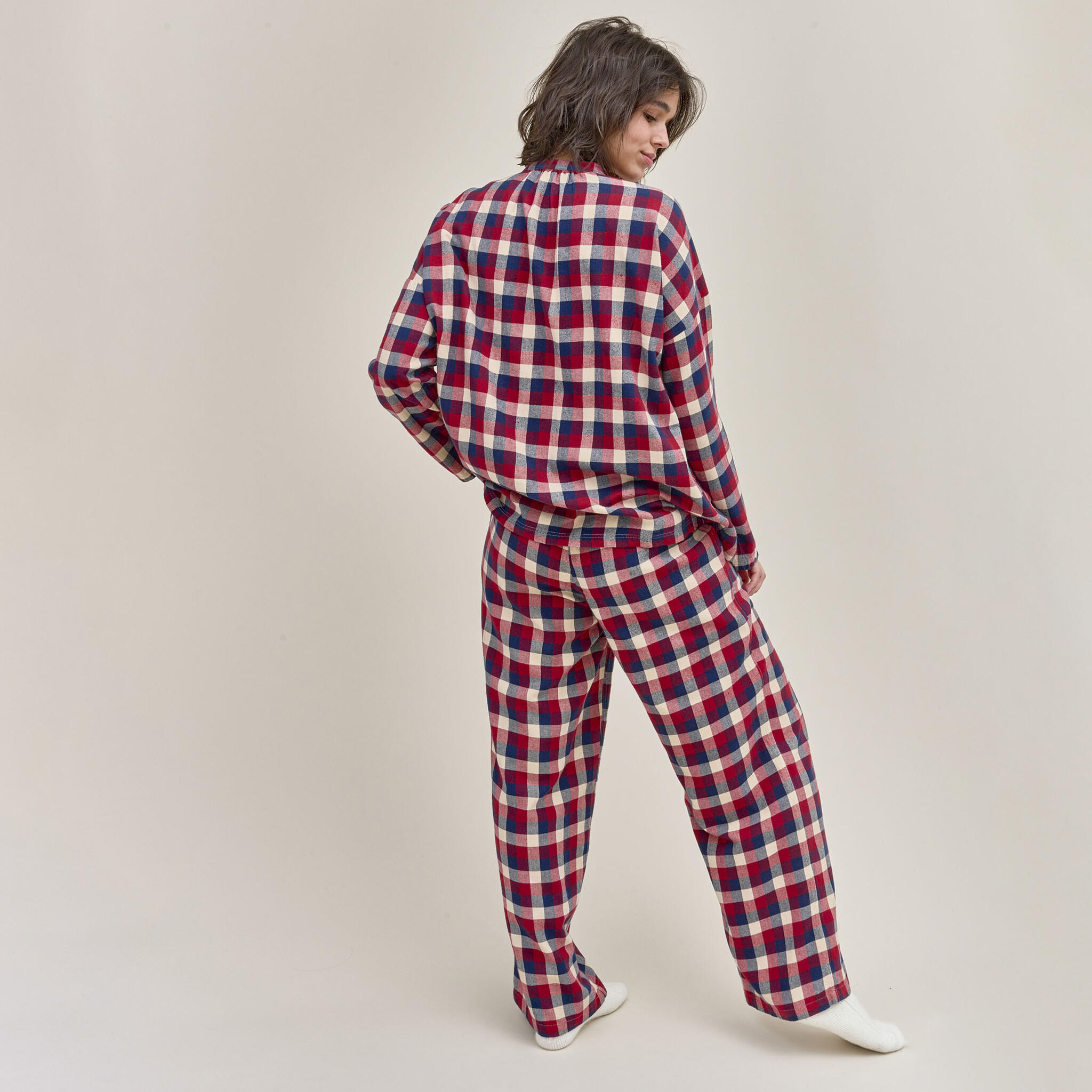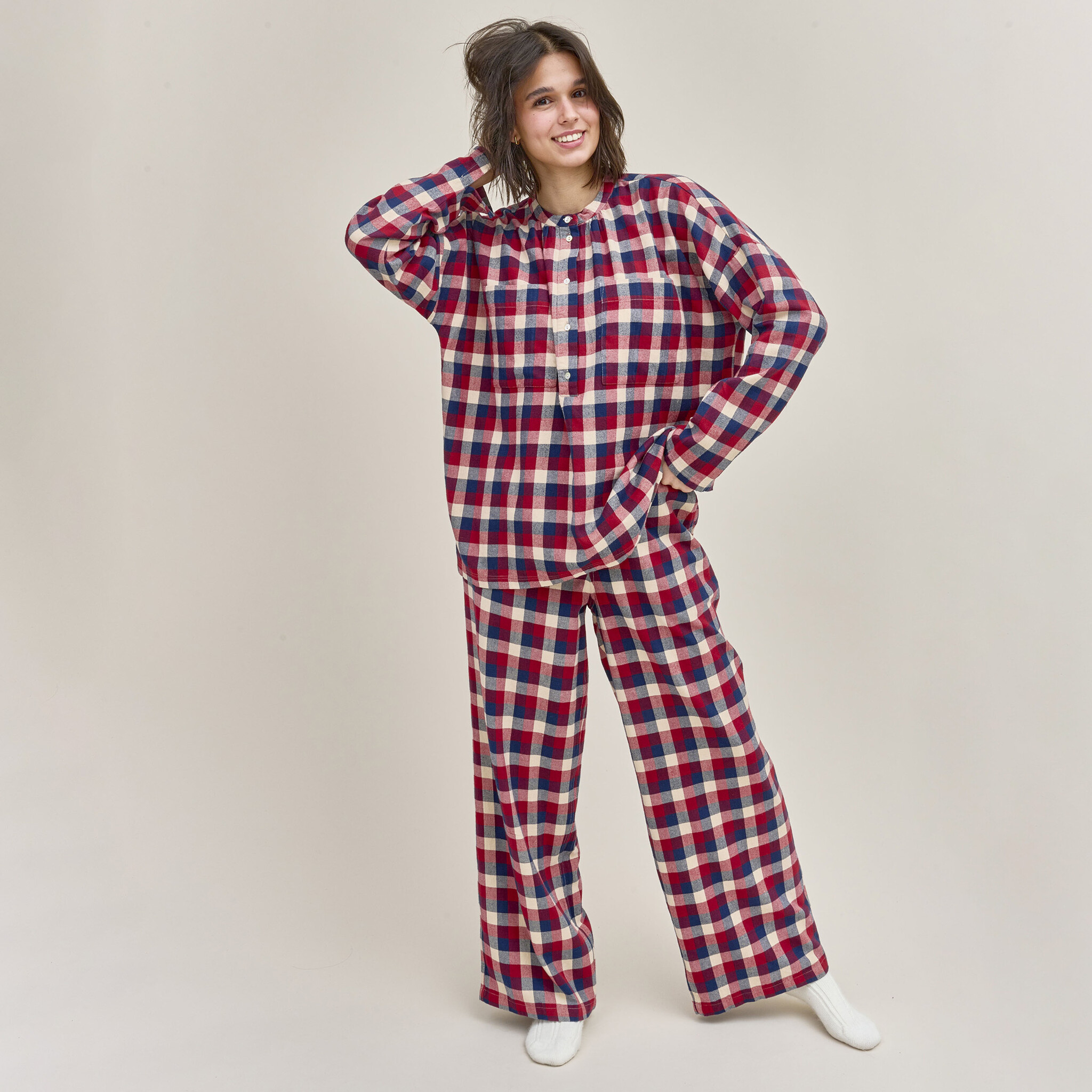 De Dorélit pyjama is gemaakt van licht ademend katoenflanel, de perfecte keuze voor comfortabele avonden en nachten. De top met knopen heeft een opstaande kraag en de lange broek is afgewerkt met een elastische tailleband.