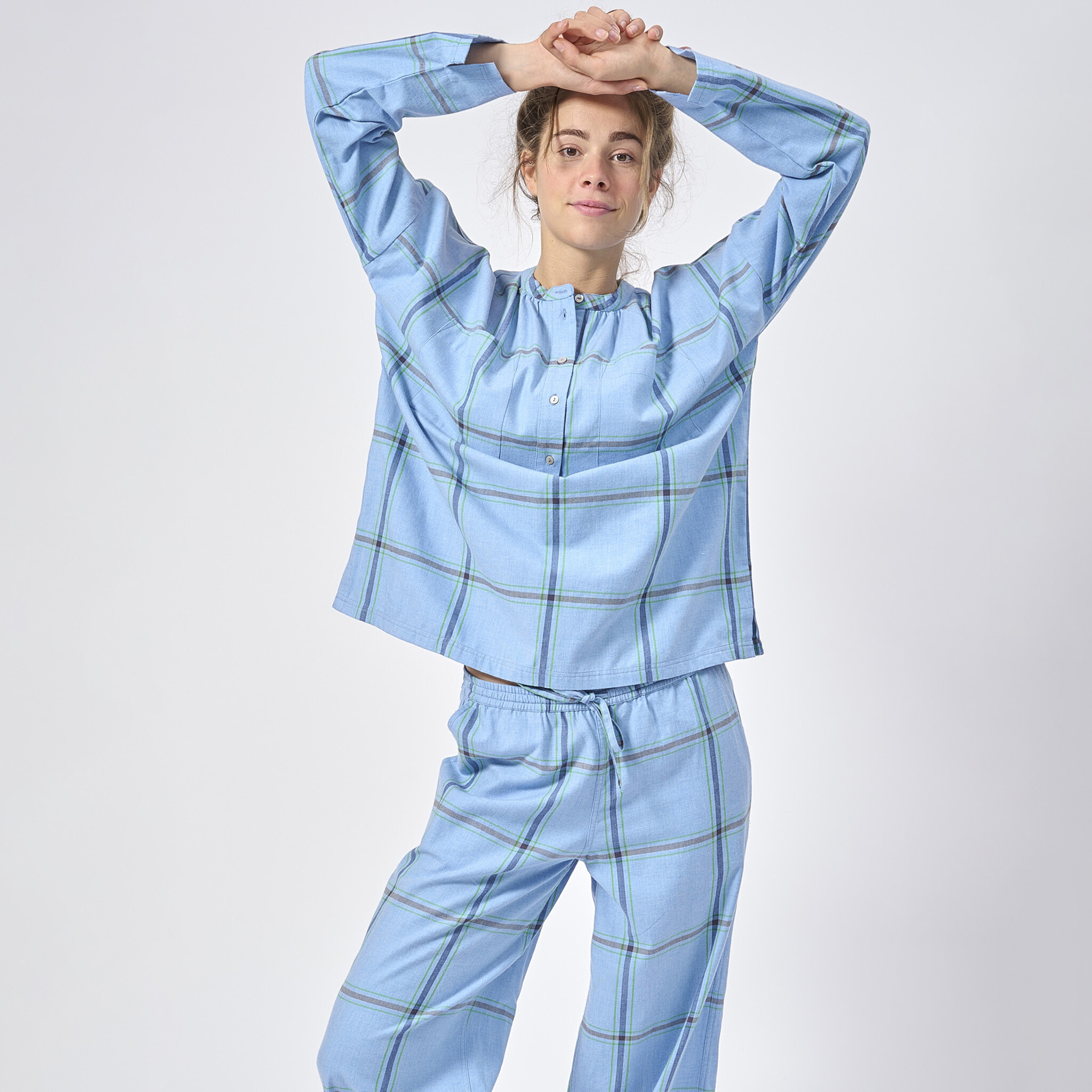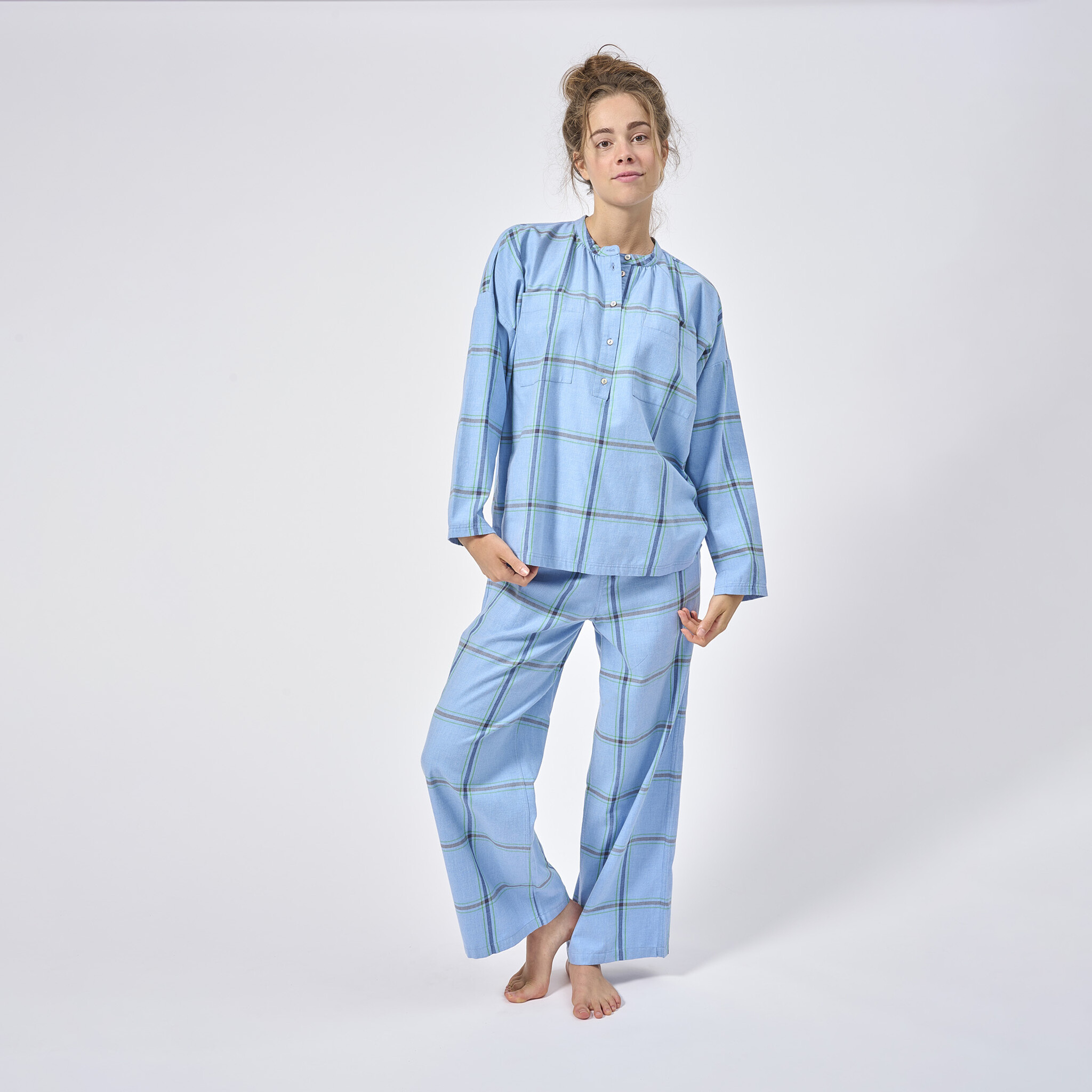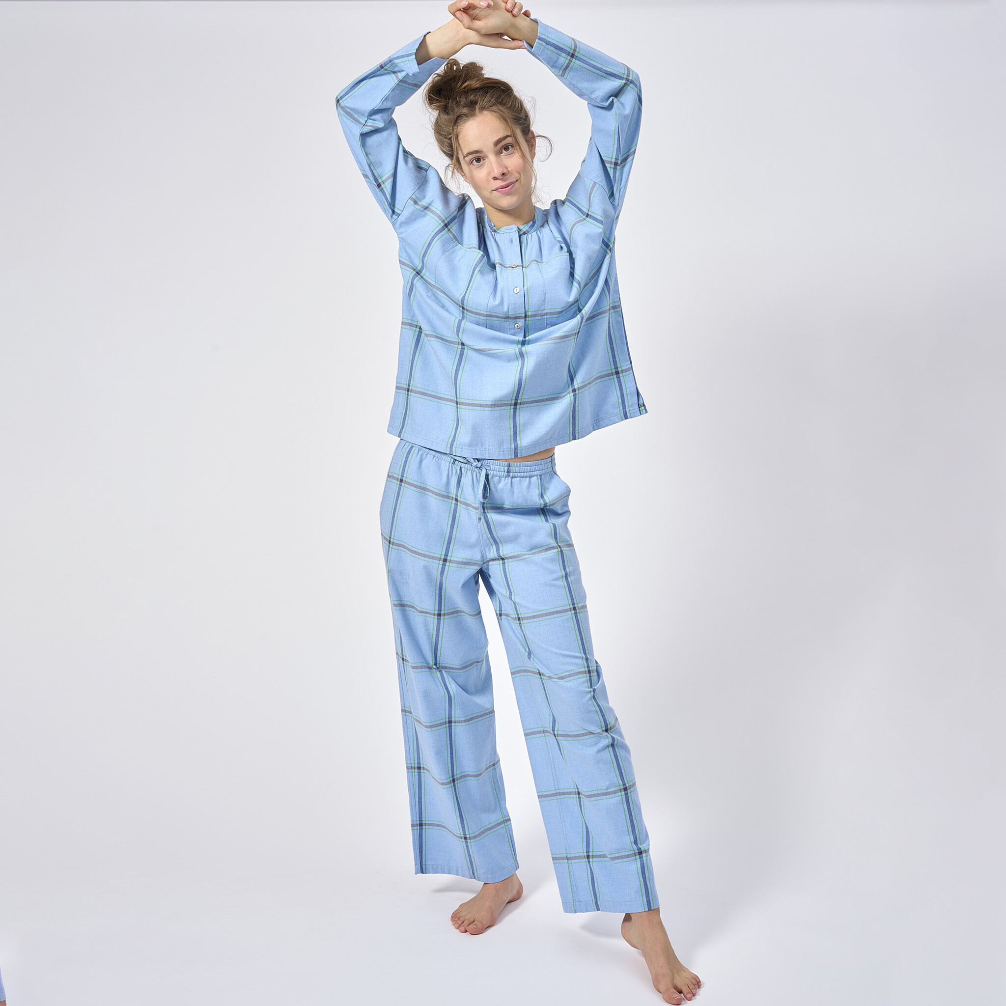 De Dorélit pyjama is gemaakt van licht ademend katoenflanel, de perfecte keuze voor comfortabele avonden en nachten. De top met knopen heeft een opstaande kraag en de lange broek is afgewerkt met een elastische tailleband.