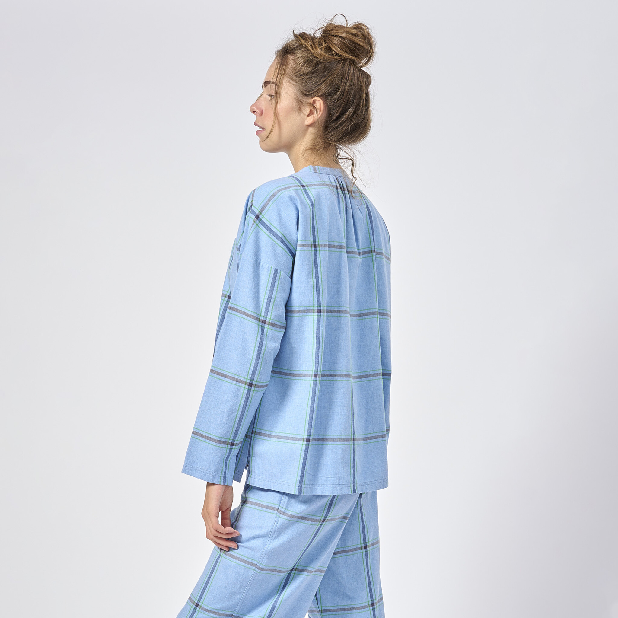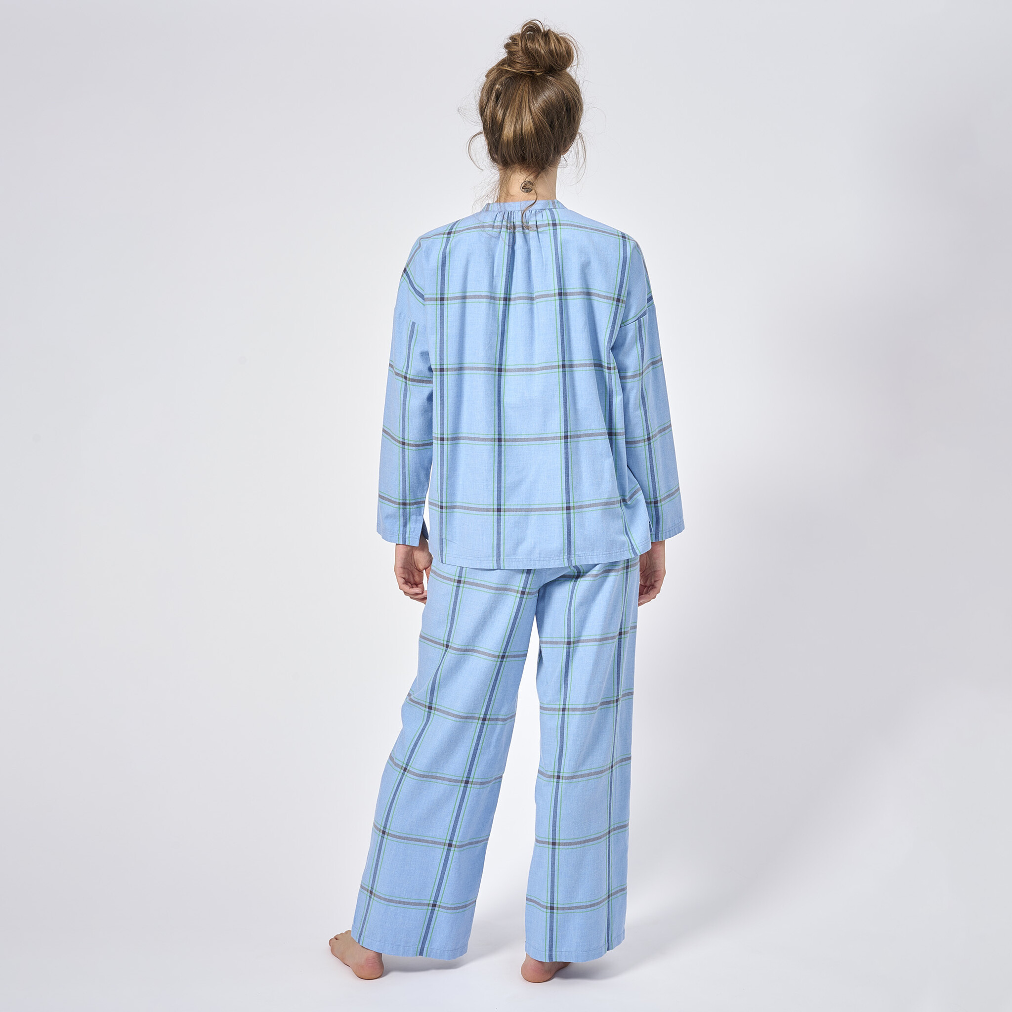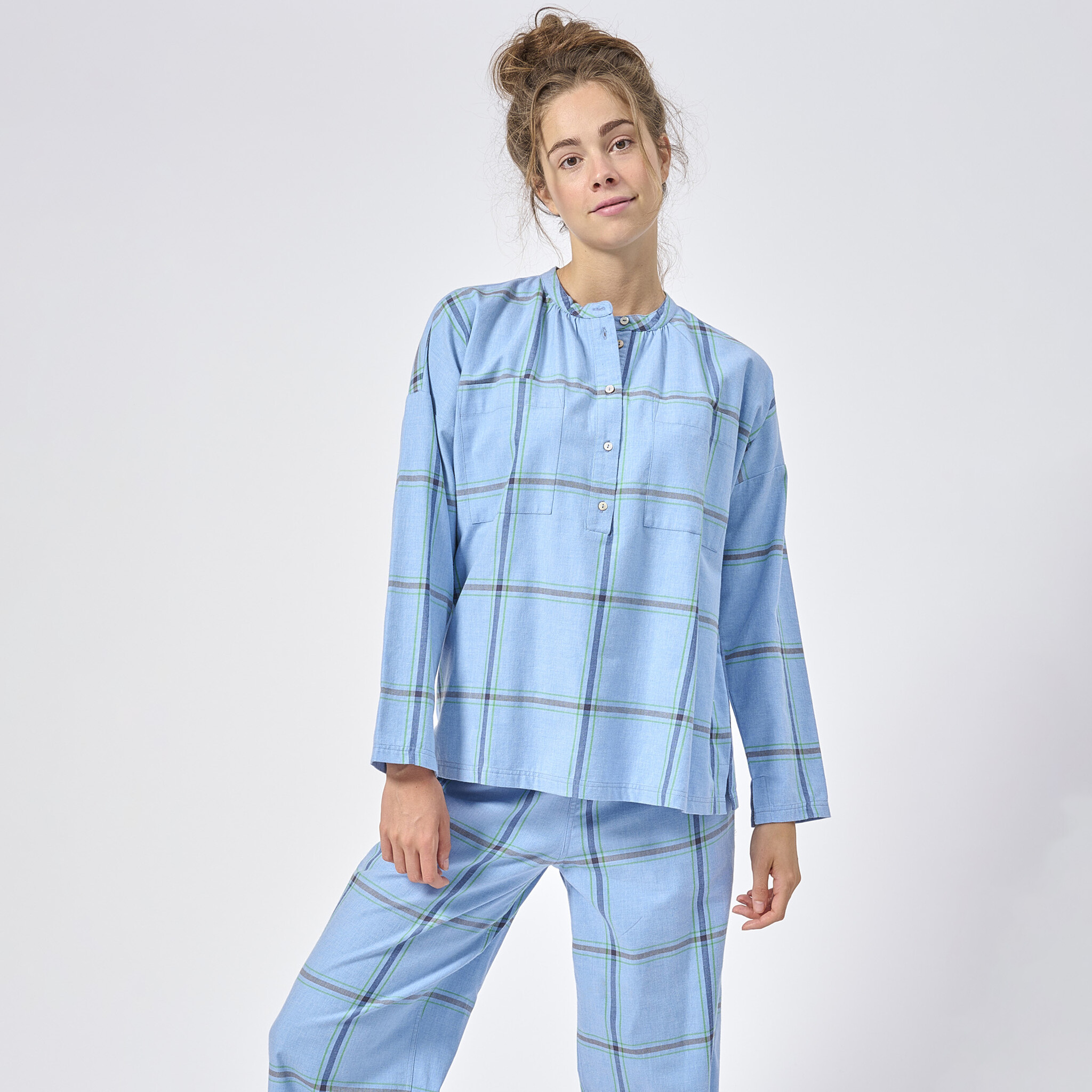 De Dorélit pyjama is gemaakt van licht ademend katoenflanel, de perfecte keuze voor comfortabele avonden en nachten. De top met knopen heeft een opstaande kraag en de lange broek is afgewerkt met een elastische tailleband.