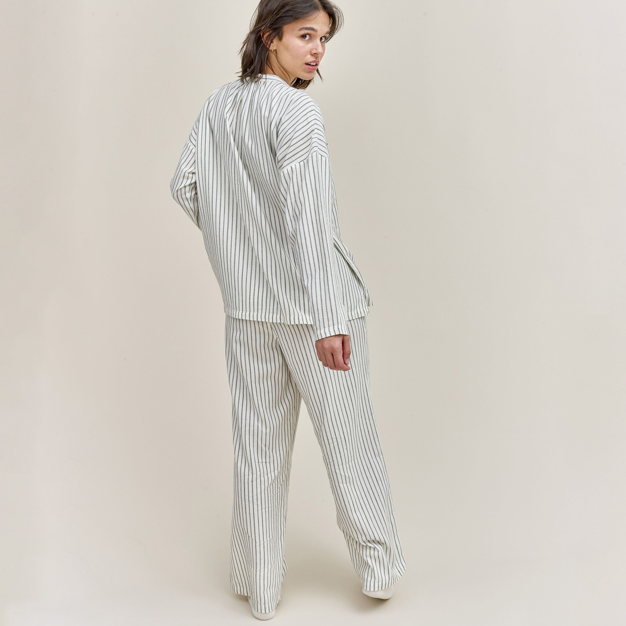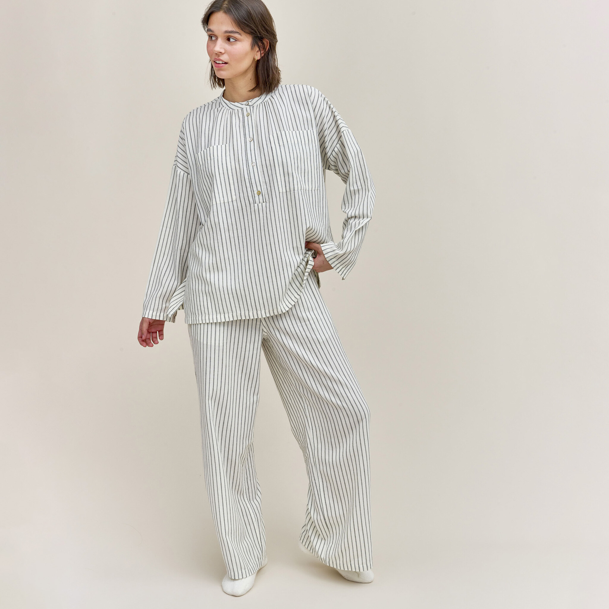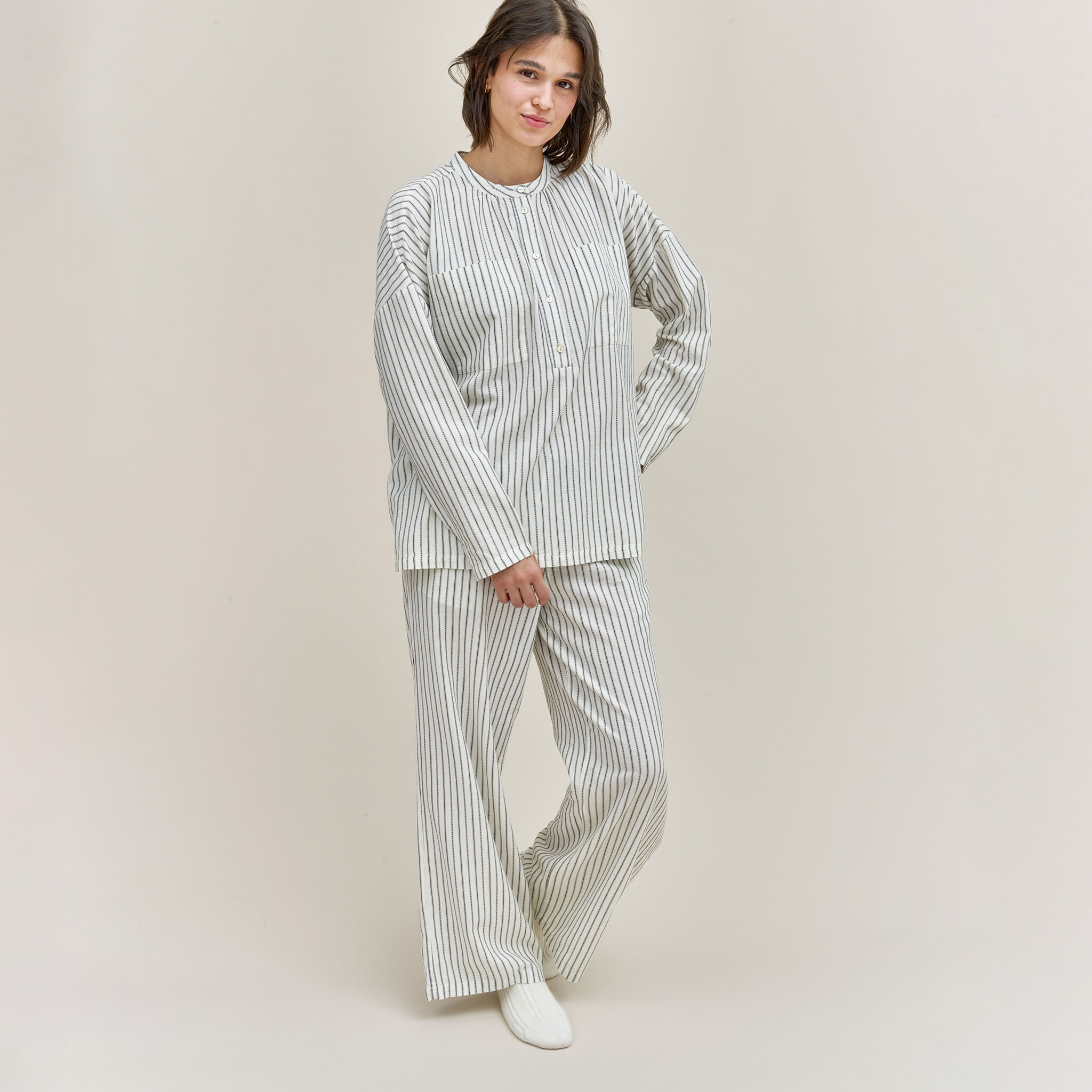 De Dorélit pyjama is gemaakt van licht ademend katoenflanel, de perfecte keuze voor comfortabele avonden en nachten. De top met knopen heeft een opstaande kraag en de lange broek is afgewerkt met een elastische tailleband.