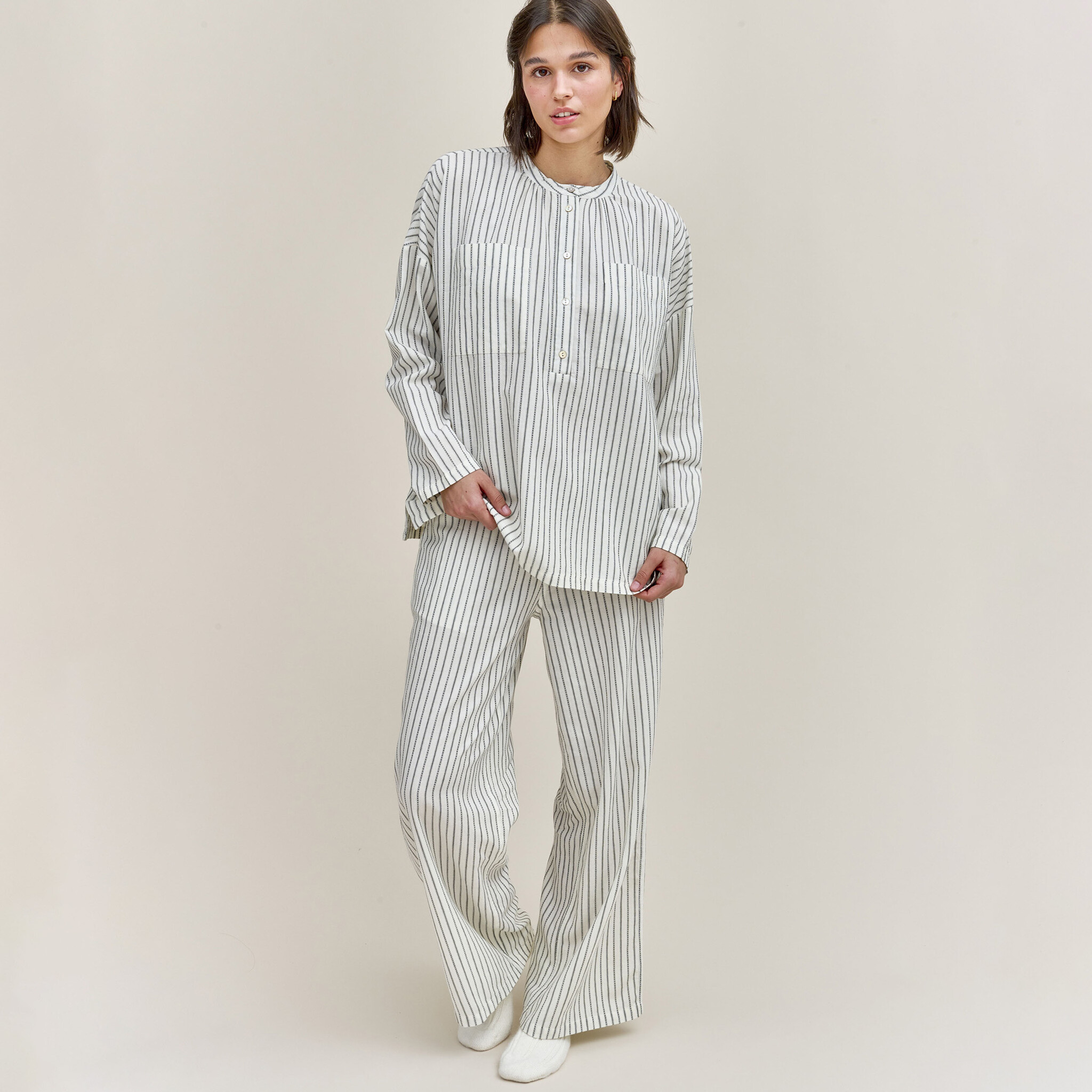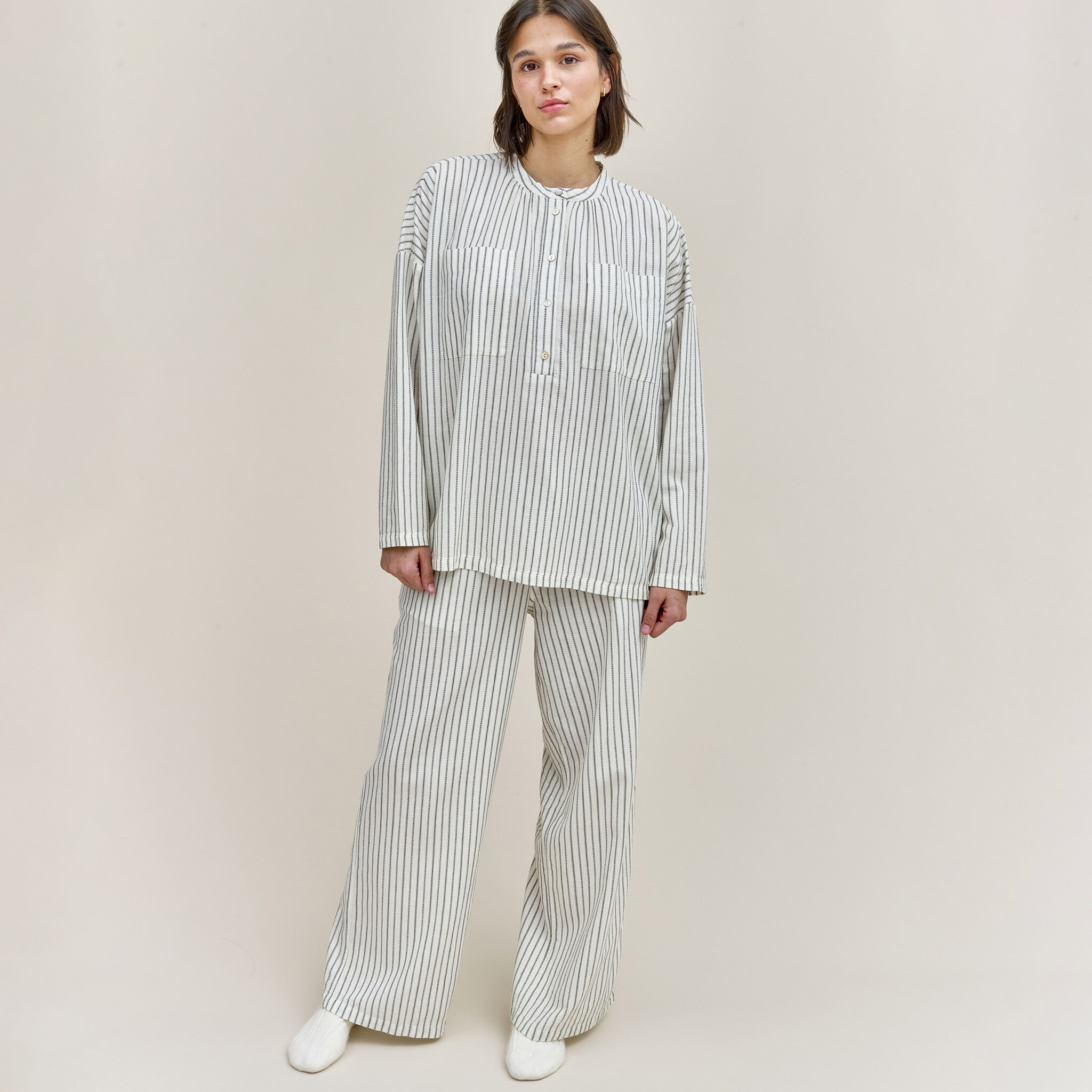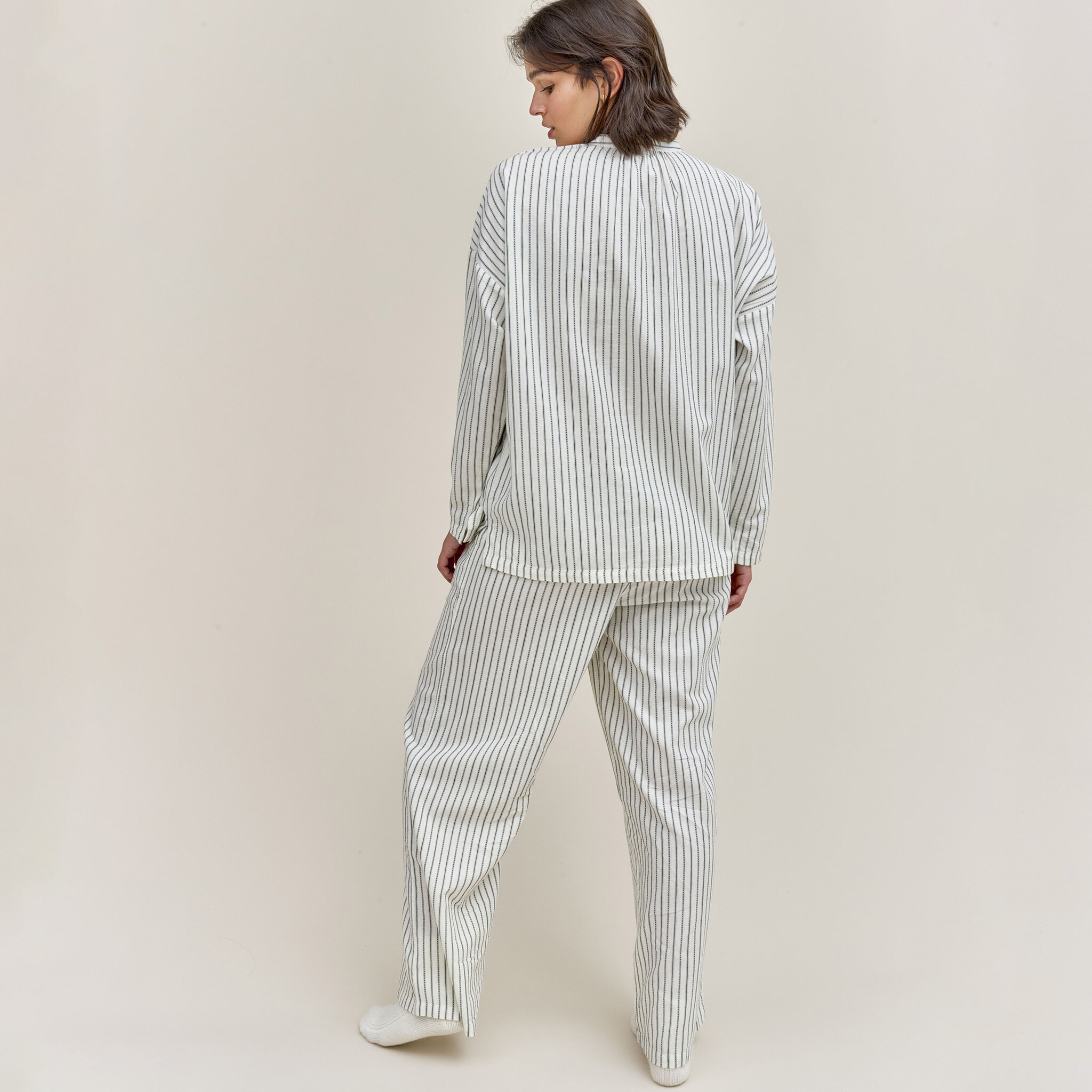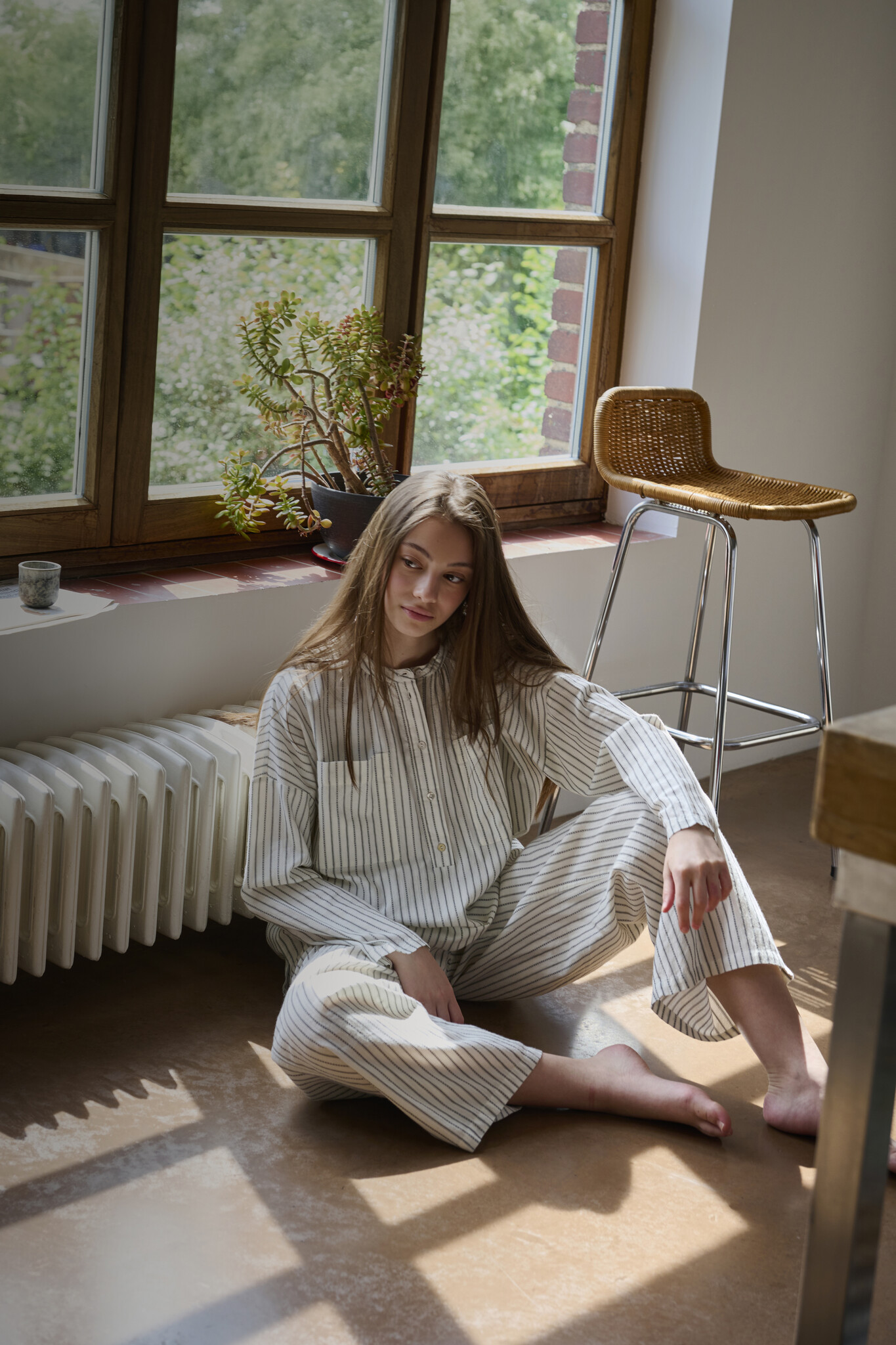 De Dorélit pyjama is gemaakt van licht ademend katoenflanel, de perfecte keuze voor comfortabele avonden en nachten. De top met knopen heeft een opstaande kraag en de lange broek is afgewerkt met een elastische tailleband.