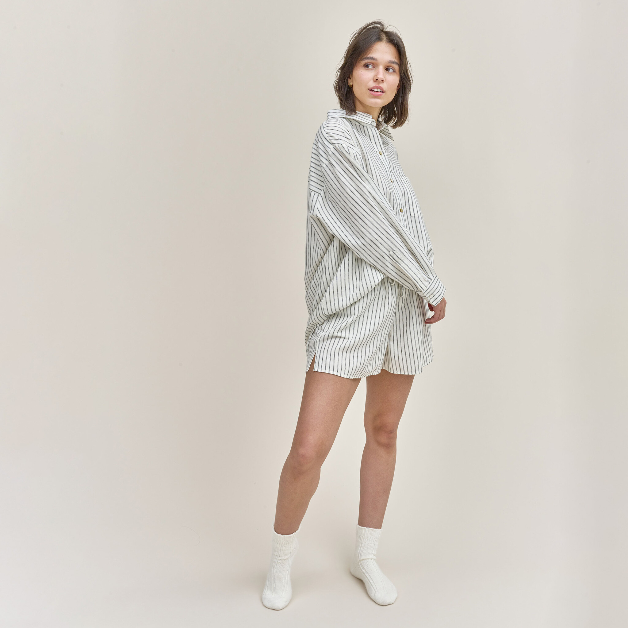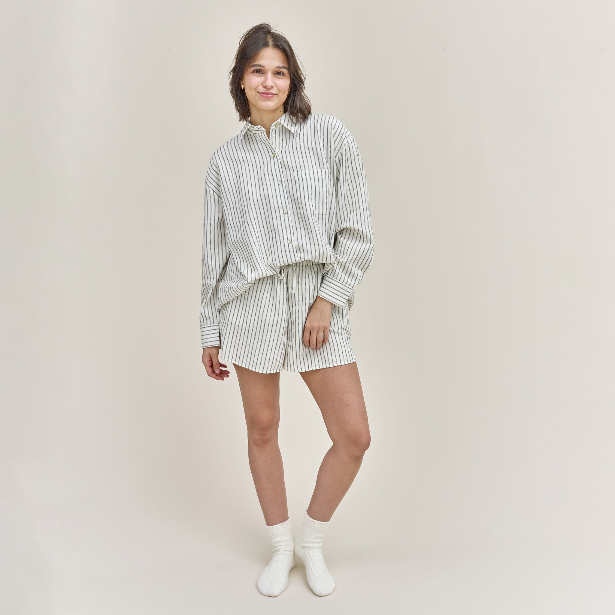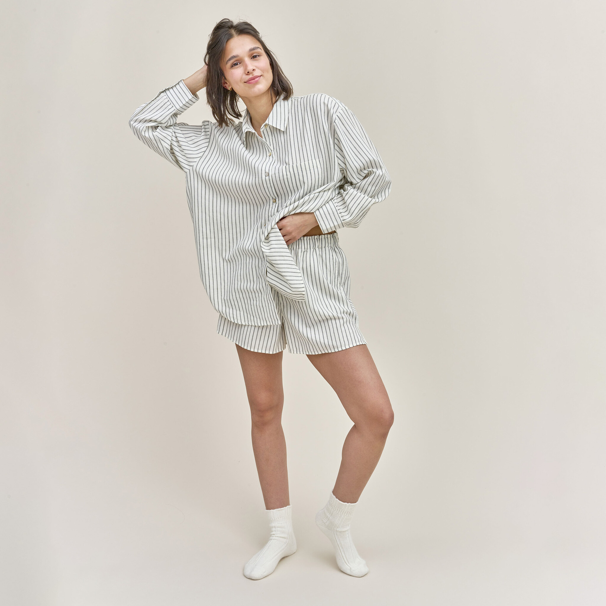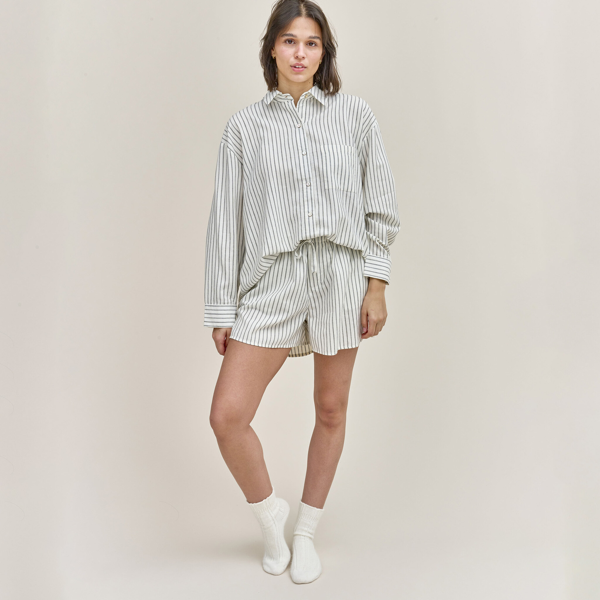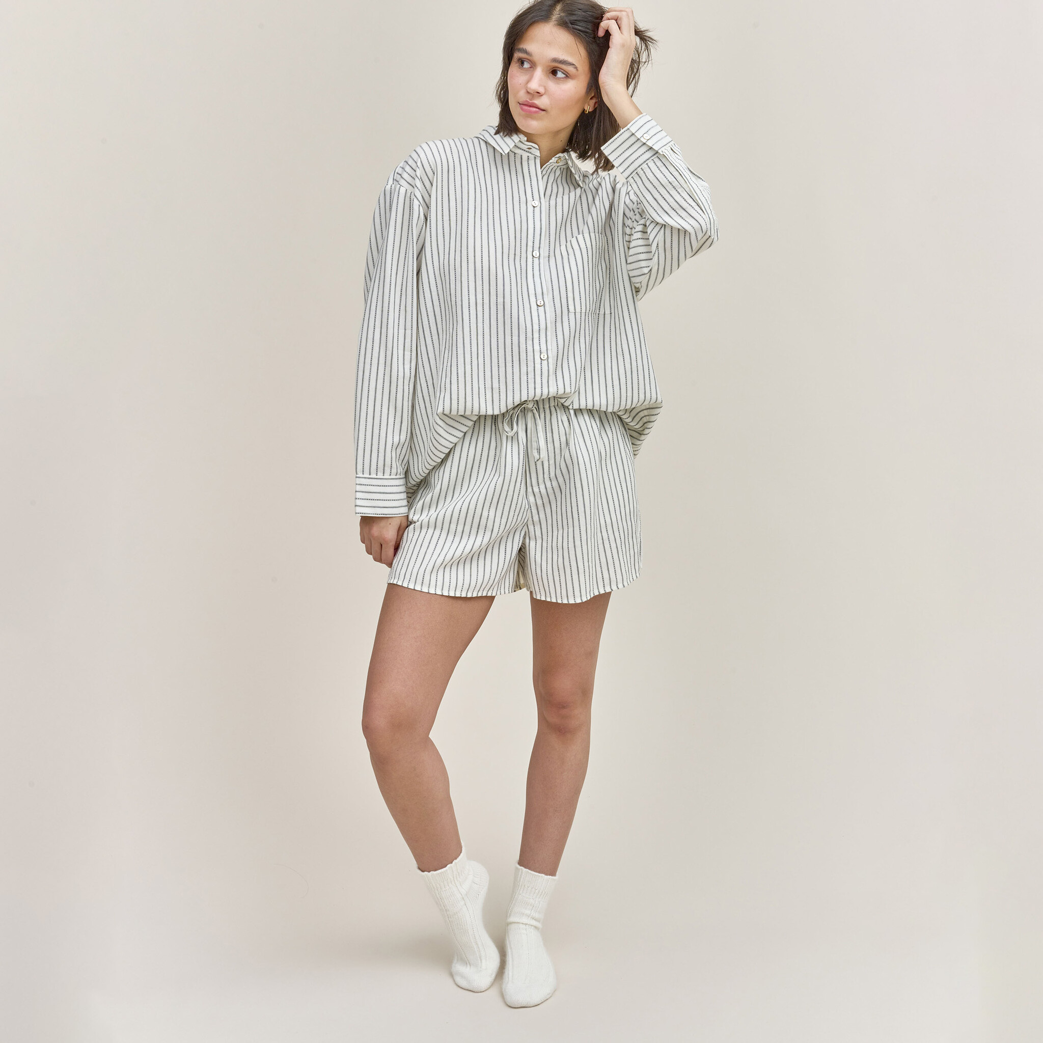 Stijlvol en oh zo comfortabel. De pyjamaset van Dorélit is alles wat je nodig hebt voor een ontspannen avondje thuis. Het oversized hemd sluit met parelmoeren knopen en de broek heeft een trekkoord en elastiek in de taille, alles voor extra gemak.